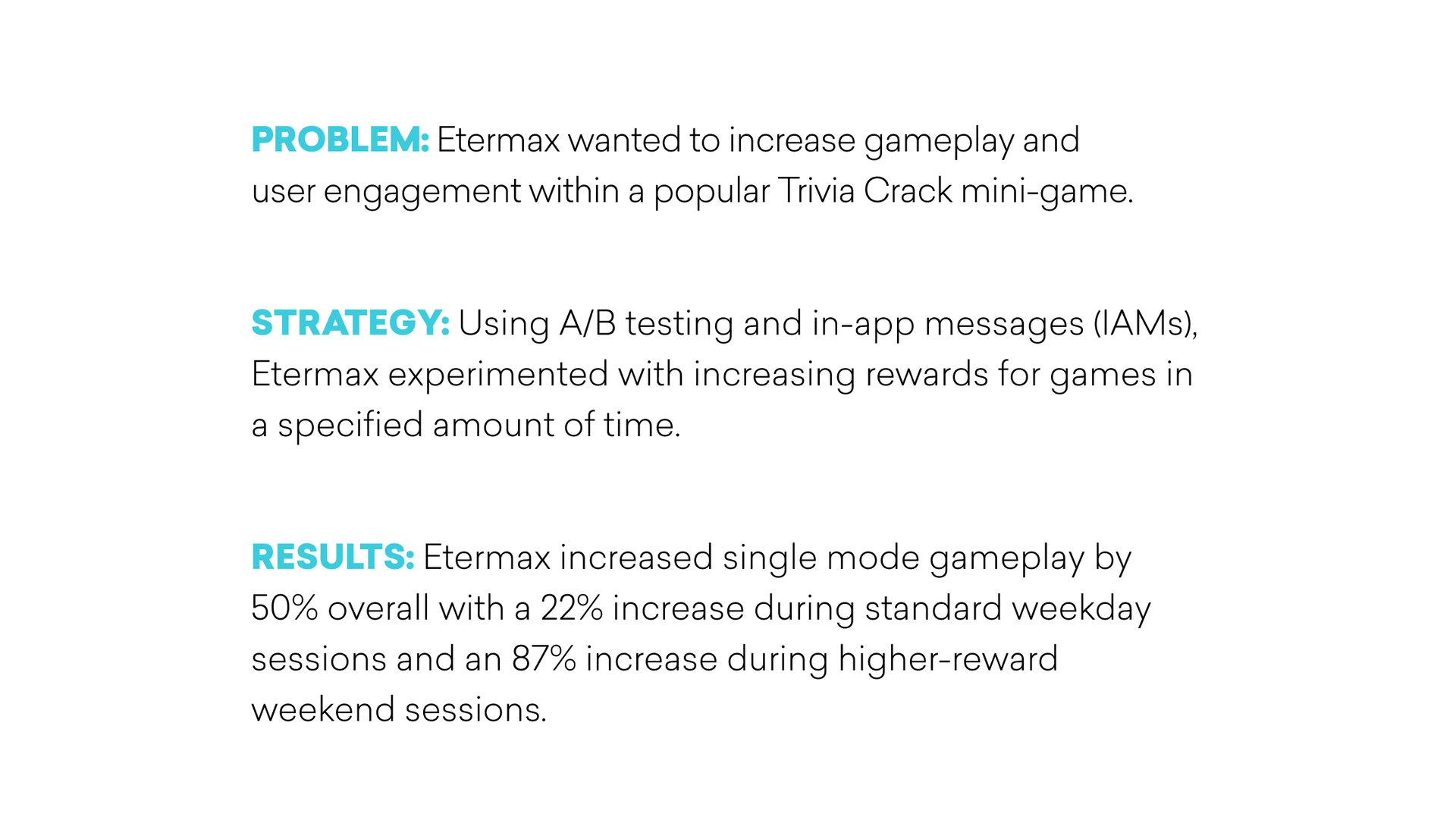 International technology company Etermax knows this. In order to continue captivating users with their trivia-focused content, the company constantly tests new ideas and iterates on success. And it’s working—they’re a leading game company in Latin America, with marketing penetration in 180+ countries. Their most popular app, Trivia Crack, has over 500 million installs.