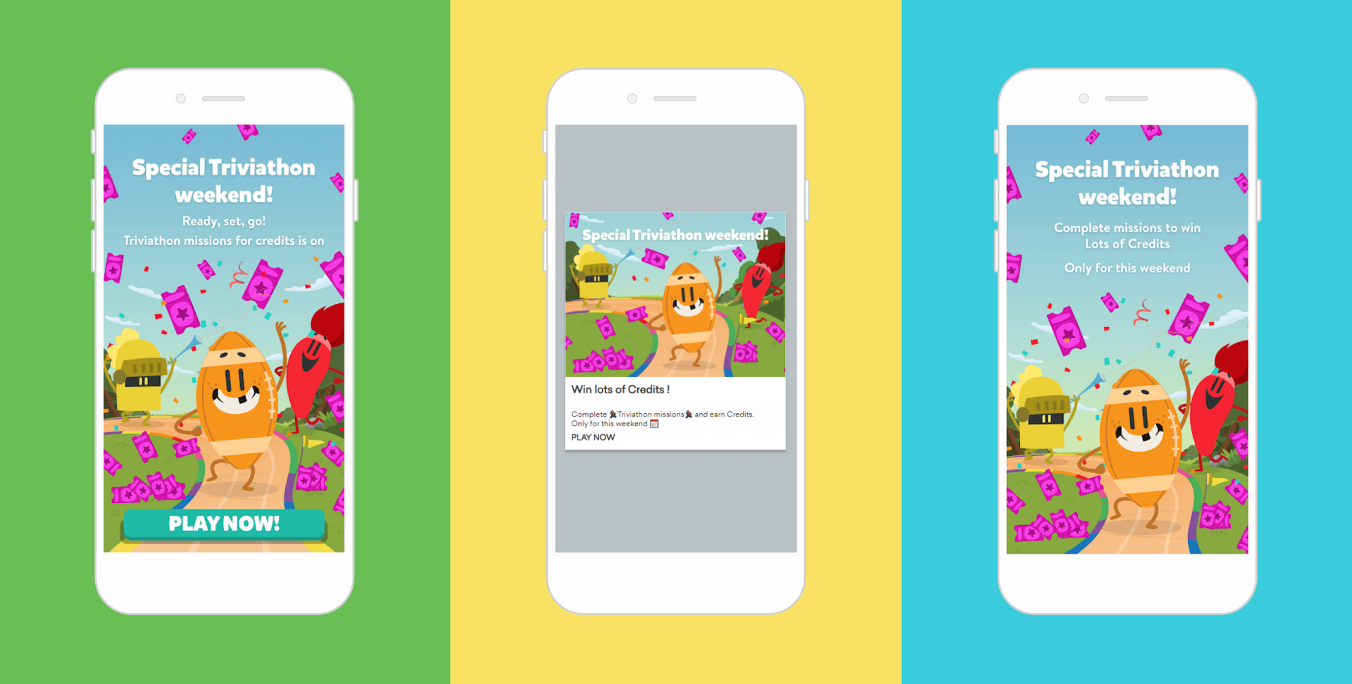 Additionally, Etermax took a cross-channel approach, complementing the IAMs with a News Feed Card that was active from Monday to Sunday, and adding a CTA with a deep link to the game starting Saturday.