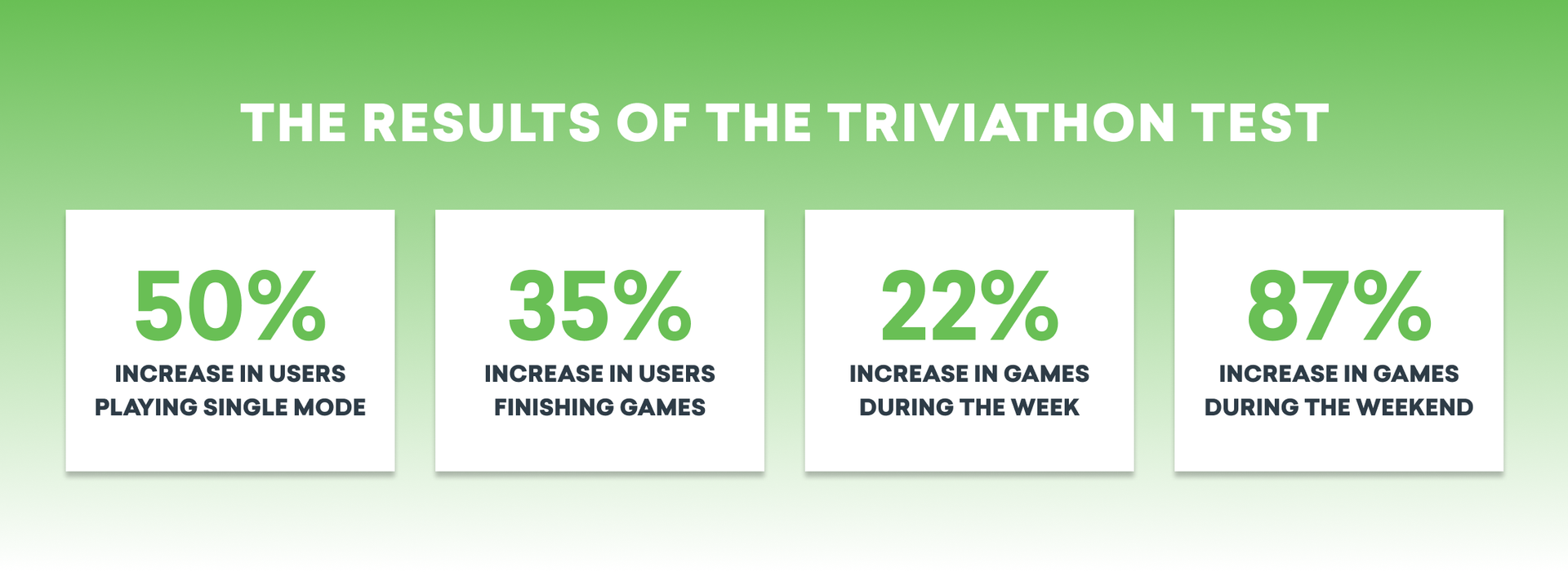 Users in group three showed stronger engagement as soon as the first IAM was deployed. Overall, there was a substantial difference: Group three had a 50% increase in users playing a Triviathon mission, a 35% increase in users finishing a mission, a 22% increase in games during the week, and an 87% increase during the weekend.