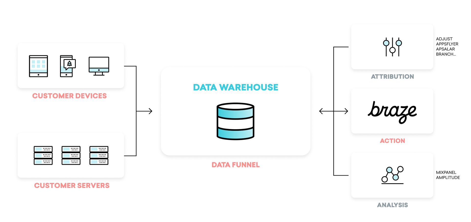 Data analytics platforms are built to allow brands to dive deep into the information at their disposal in order to find hidden insights, better understand high-level trends, and use those discoveries to inform the creation of future experiments, audiences, and segments. By integrating with Braze, these technologies make it possible for brands to leverage the insights and information contained within their analytics provider to support more impactful brand experiences powered by Braze. These solutions include: