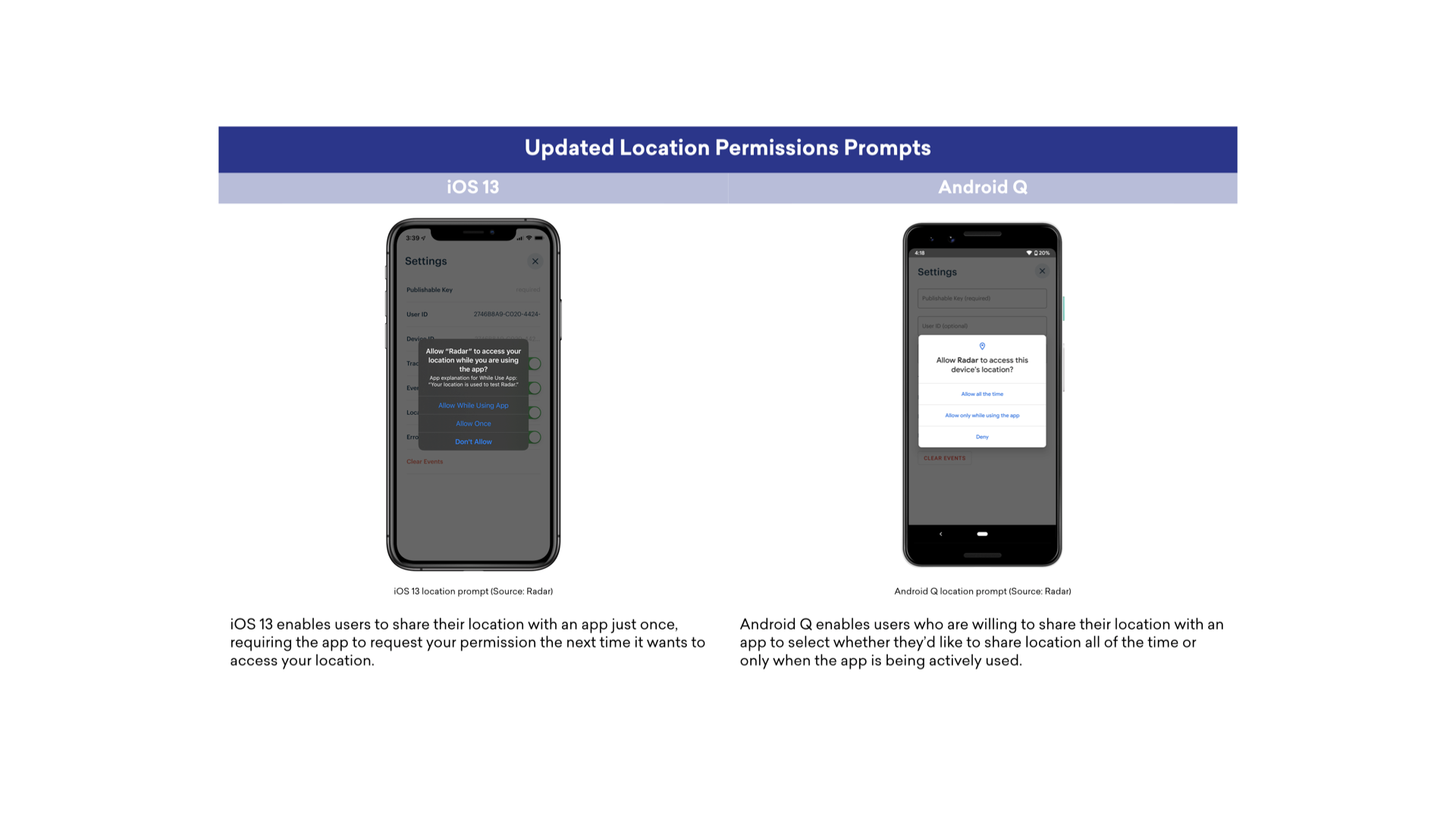 For Apple customers, iOS 13 brings the option to share location “just once”, meaning that any time an app looks to track your location again, they will have to regain your explicit permission/consent. Android Q has also put an emphasis on location permissions for all apps interested in using your location will show a prompt asking whether you’d like to share location at all times, only while using the app, or never. Android users can also “audit which apps have what access to [their] location” by navigating to Settings and then Location.