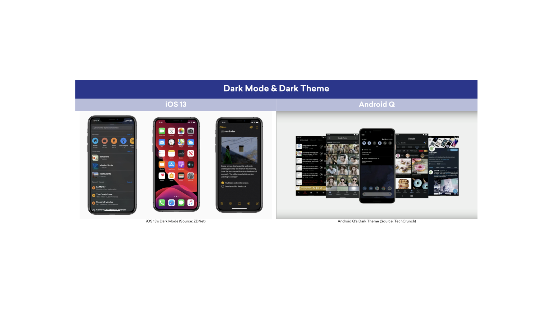 Dark Mode & Dark Theme provide another way that users can customize their digital experience, and both Android Q and iOS 13 now support a darker UI.