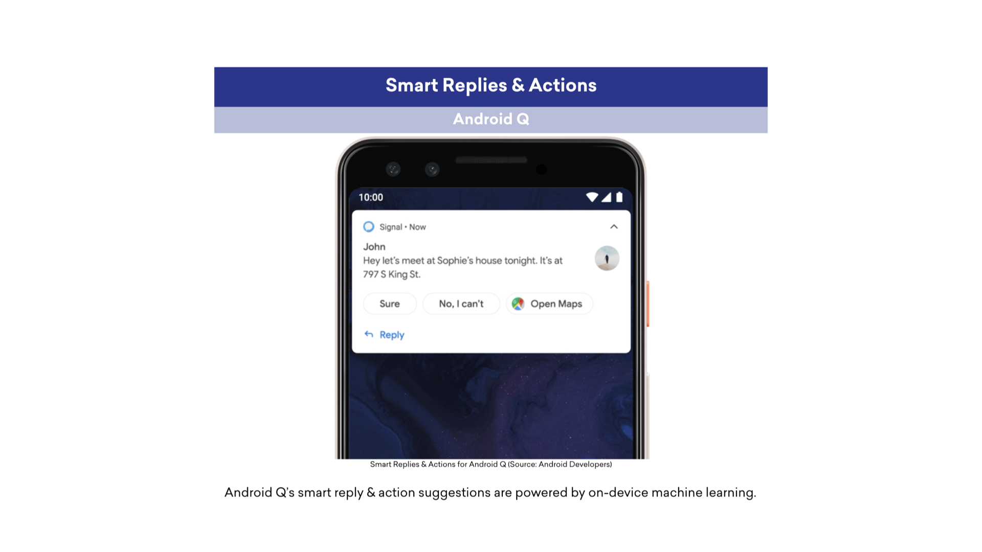 In addition to upgrades in speed, both Google and Apple are leveling up their focus on machine learning. Google has been thinking about machine learning for a while now, and new features from Android Q highlight their innovative capabilities when it comes to intelligent automation. Android Q uses machine learning for smart replies & actions by predicting how customers would respond to an email, message, or even a notification, prompting users with either text responses, or a suggested action, depending on the message.