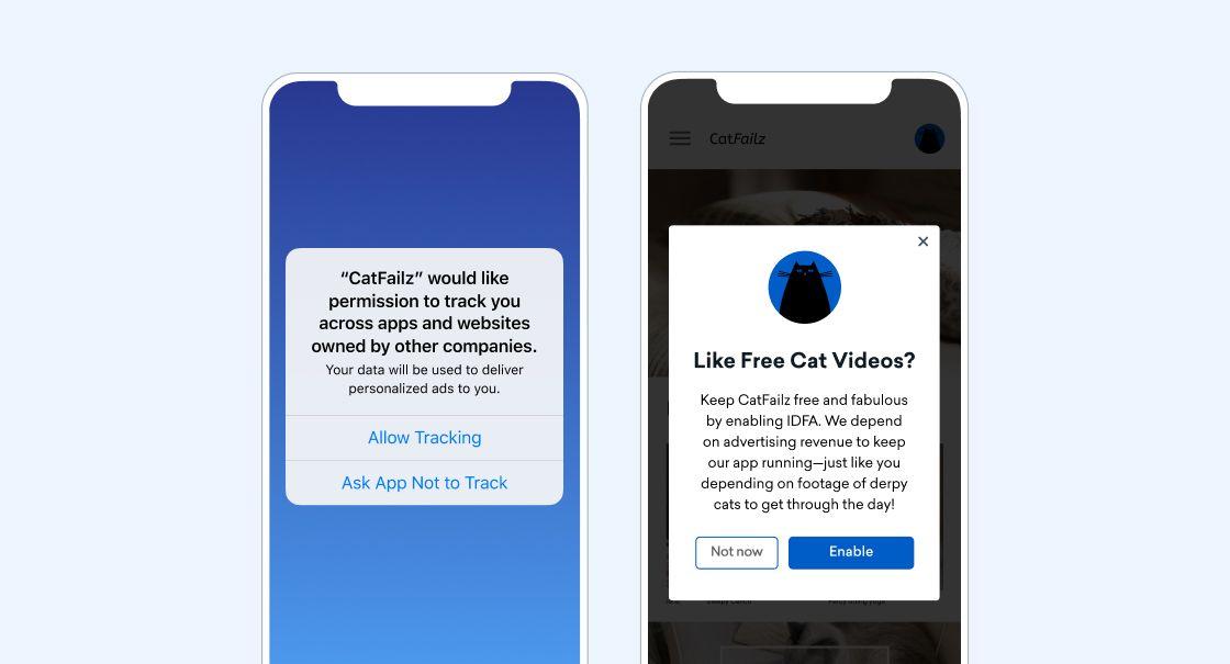 Apple’s Identifier for Advertisers (IDFA) was launched back in 2012 in order to create an individual user ID that could support cross-device advertising by third-parties. And since its launch, IDFA has been used to power tactics like third-party digital retargeting ads and multi-touch attribution within the advertising technology (AdTech) space. While these experiences were often quite visible and even intrusive—think of all the times you browsed a shirt on a clothing website and then found ads for that shirt following you around the internet for weeks like a lost dog—the actual information collection that powered them all happened behind the scenes. Companies could leverage IDFA from the moment someone installed their app, no permissions or pop-up notifications required.
