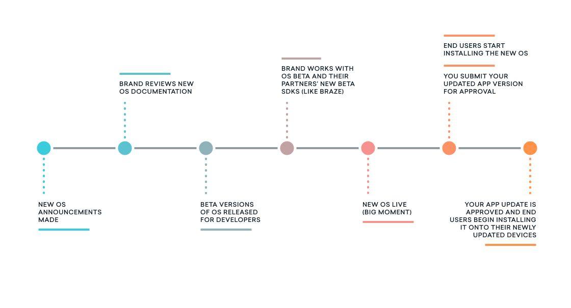 Before we dig into specifics, let's talk about the big picture: The actual update process associated with the launch of these updated operating systems. With iOS, for instance, there are basically four main stages in the transition from iOS 13 to iOS 14. First, Apple has to release the new OS to the general public. At this point, the billions of iPhone users around the world can start to update their iPhones to iOS 14. If you want your brand’s app to support iOS 14, you need to then update the SDKs in your app (such as the Braze SDK) to be in line with the latest versions, as well as ensure your app code supports new features (like data collection permission prompts). You’d then submit the updated app to Apple for approval. Assuming it’s approved, your app users would then get that update on their phones and begin using both iOS 14 and your iOS-14-supported app. There are risks associated with not updating your app to support that latest OS, too. You may be using deprecated or even removed APIs if you don’t keep up to date with OS upgrade. Or you may be relying on data available for easy collection in an earlier OS, that requires specific user prompts in the latest OS version (ahem, IDFA again).