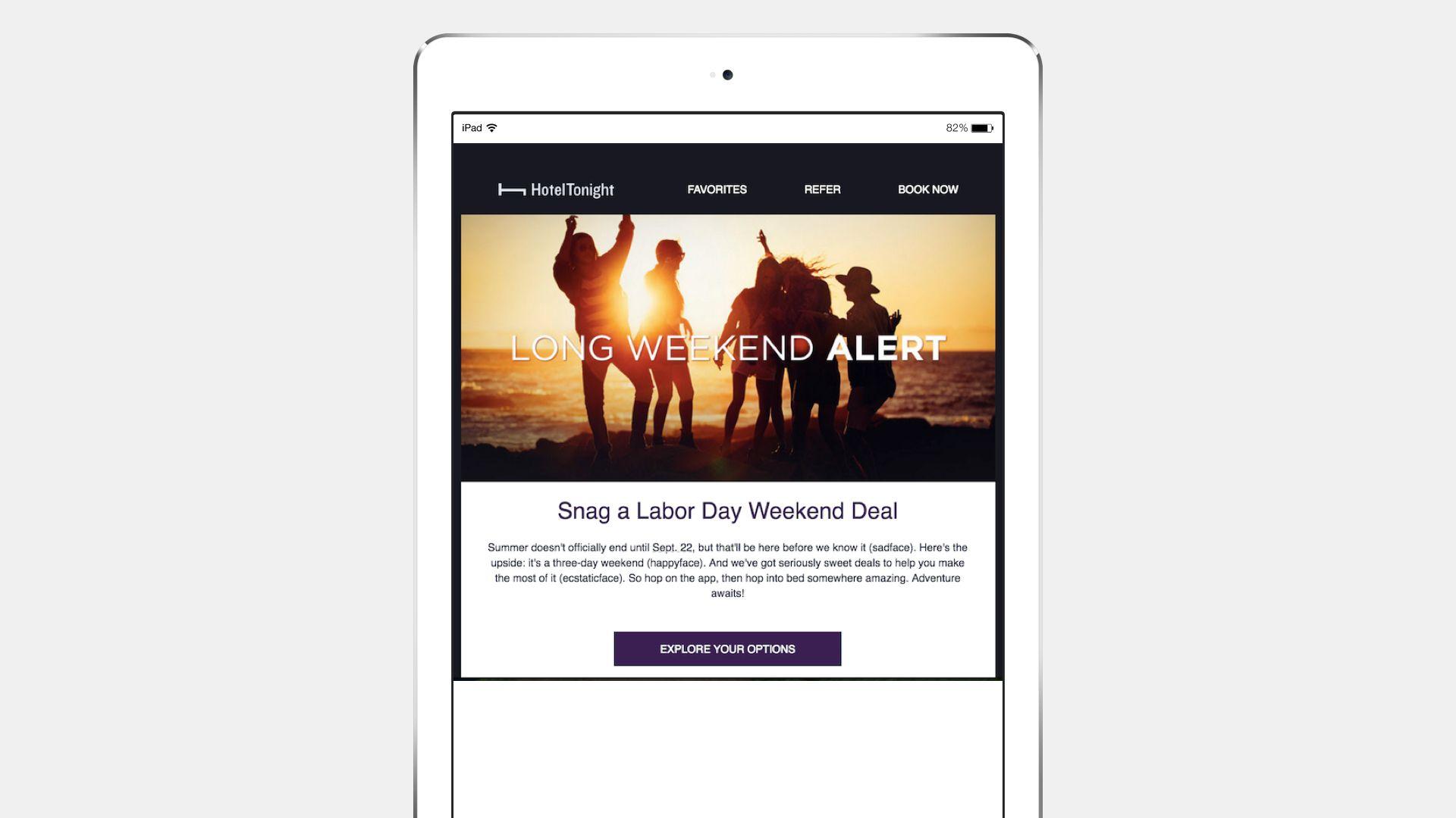 Here’s an example of a mobile app marketing campaign, outside of gaming, that also appeals to its users emotions to stand out. HotelTonight is an app that helps travelers find last-minute hotel deals—an interaction that is promotional by definition.