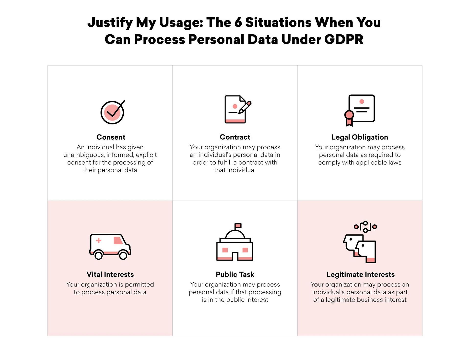 Under GDPR, the processing of personal data is only lawful when it falls under one of six approved justifications.