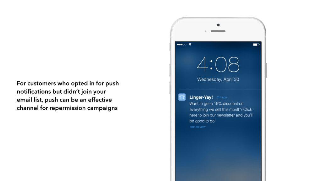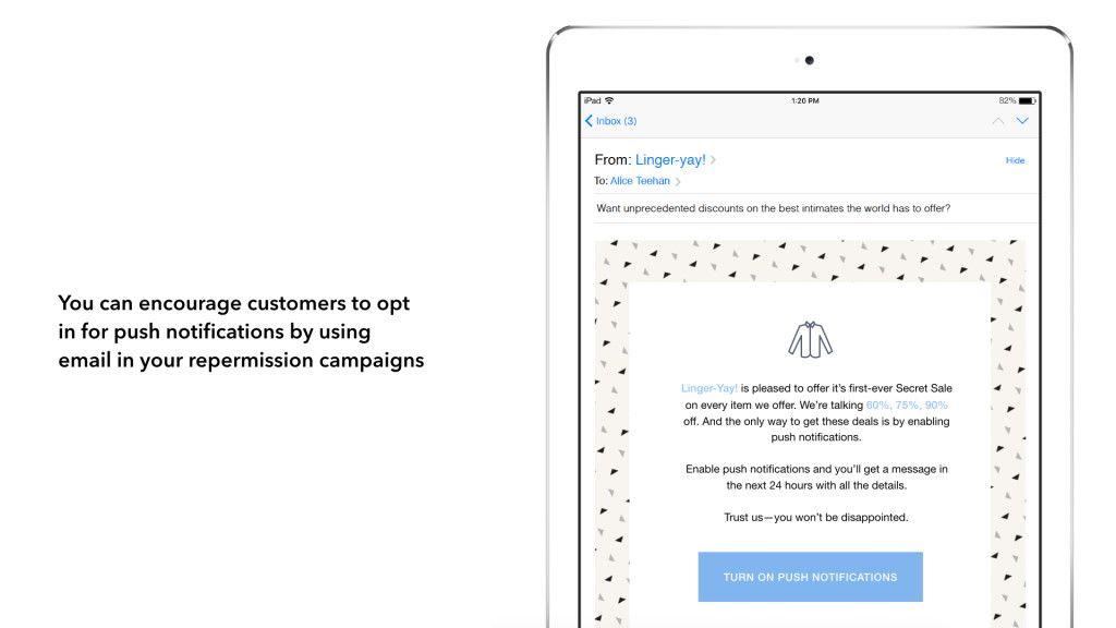 You can’t send a re-permission campaign if you don’t have any way to reach the customers you’re trying persuade. Someone who has opted out of push notifications obviously can’t be reached using that channel; the same goes for someone who has unsubscribed from your email list. That means that re-permission campaigns for messaging permissions often require your brand to have multichannel messaging capabilities.