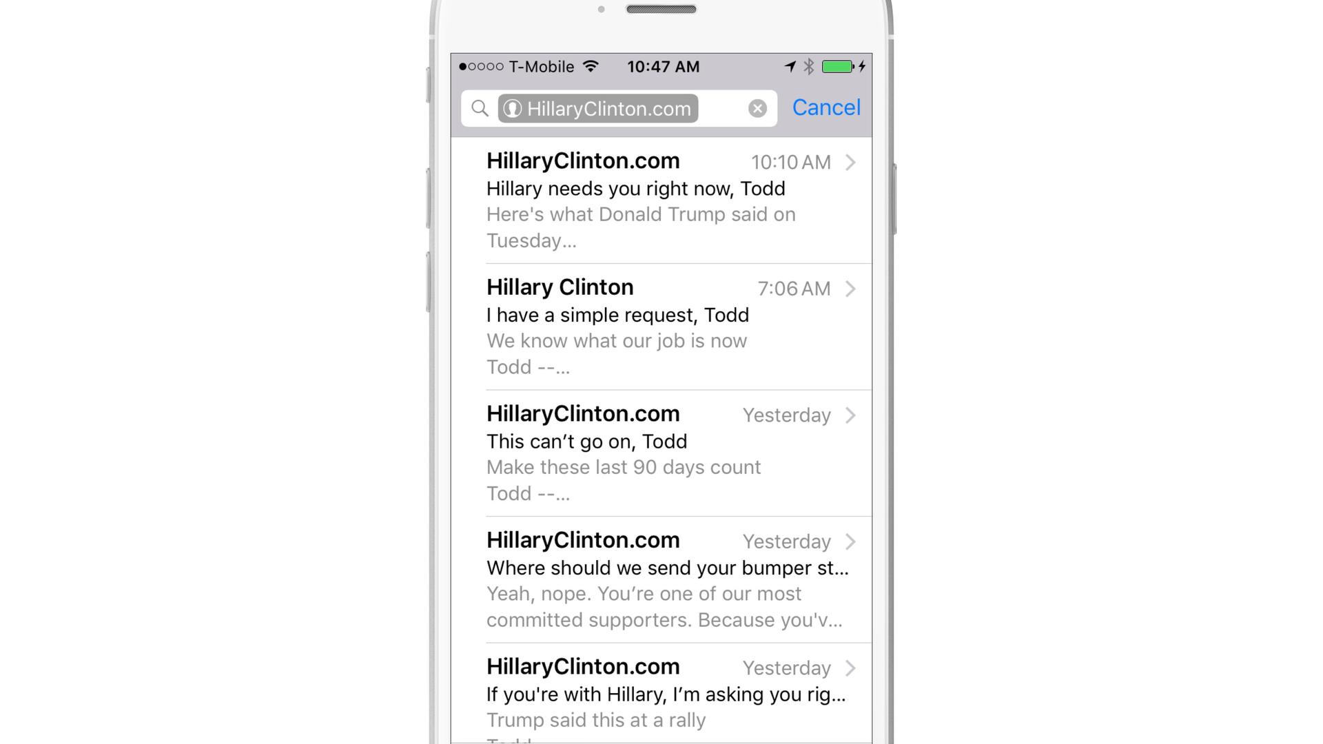 Emails received from the Clinton campaign during the first 24 hours of app usage
