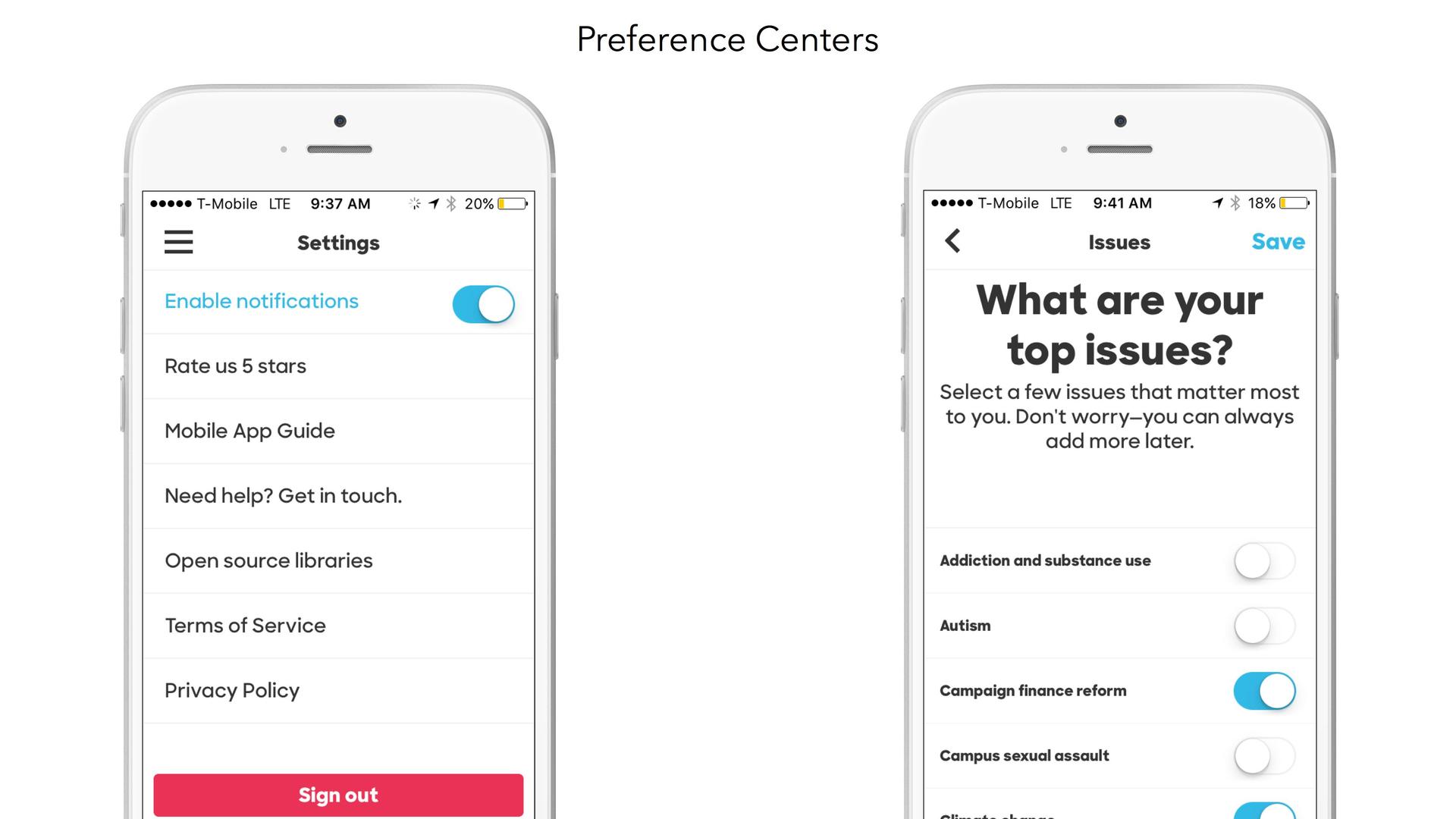 Adding a preference center within your app makes it easy for customers to let you know whether they’re interested in being reached through certain messaging channels and what topics they’re most interested in being contacted about, allowing users to self-personalize and making it more likely that they’re interested in (and engage with) the messages you send. In the Hillary 2016 app, users are given access to two preferences centers—one simple, and one rich.