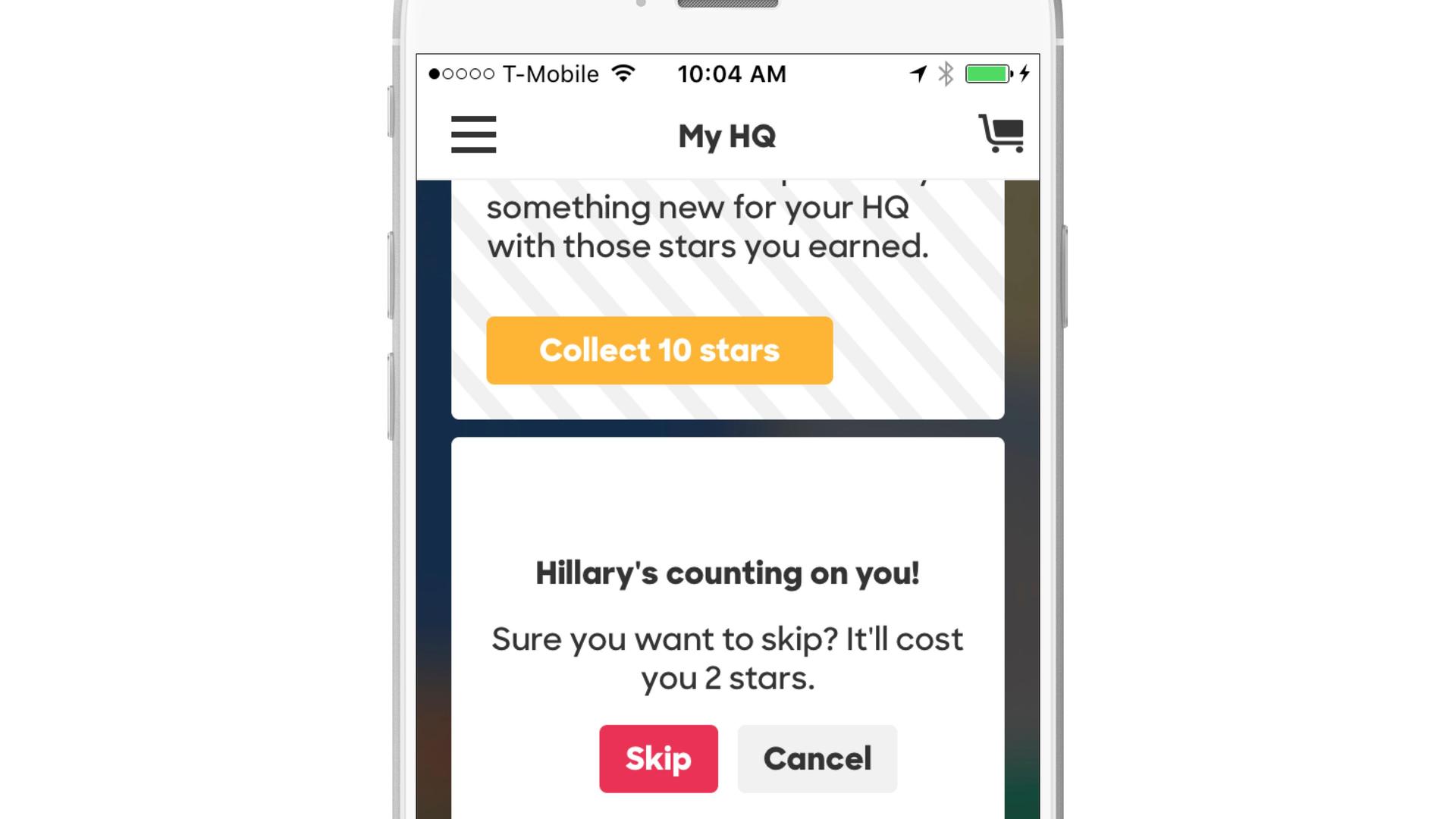When a user first opens Hillary 2016, they’re greeted by an interactive illustration of a campaign office, complete with fliers and plants that need watering. But if a user DOES water the plants, explore the office, begin checking out other parts of the app, they’re rewarded with stars, which can be spent on office furniture and other decor—allowing them to customize the look of the app—or on real-life swag like a Hillary Clinton autograph.