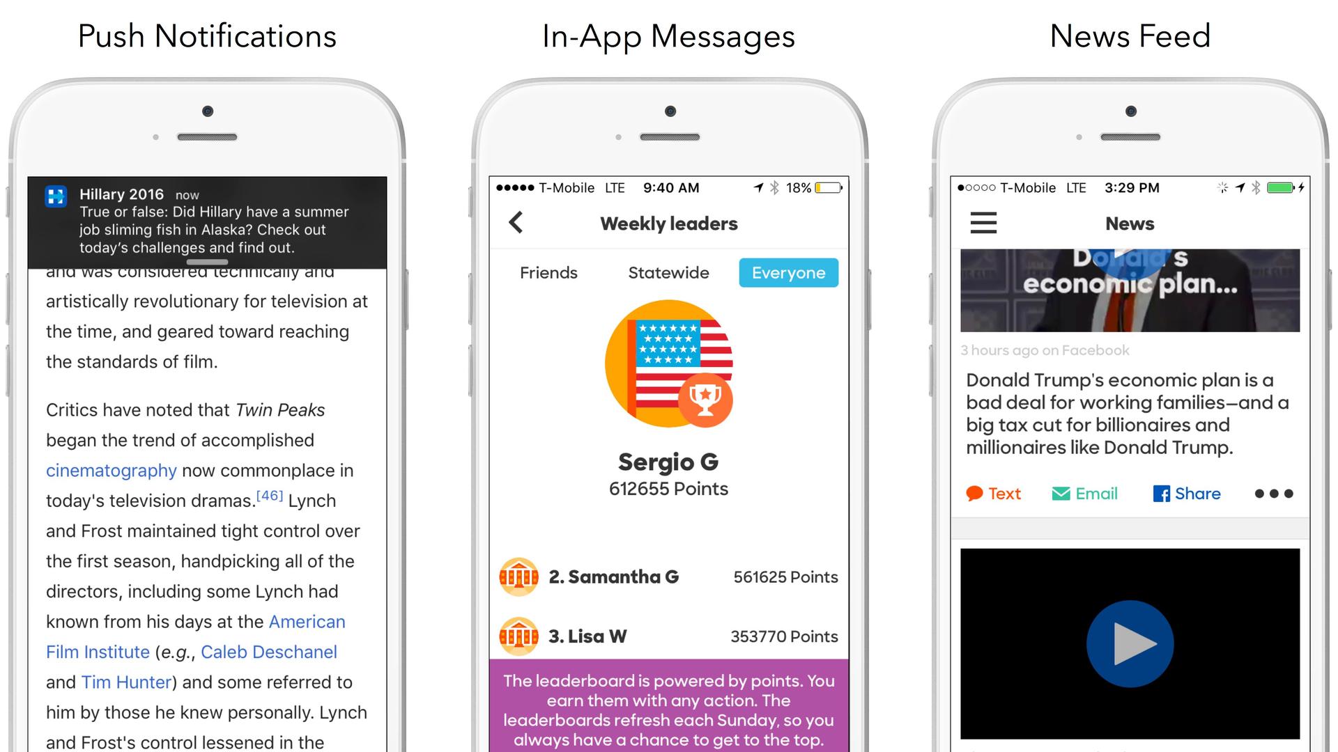 When you’re looking to reach users effectively, you need a multichannel messaging strategy. By communicating in different channels in a coordinated way, you get more opportunities to connect with customers, more insight into which channels they prefer, and the ability to significantly boost user retention. And the Hillary 2016 app does an unusually robust job incorporating multiple outreach channels into its user messaging, with push notifications, in-app messages and a news feed all used to communicate effectively with the Hillary supporters in a seamless, comfortable way.