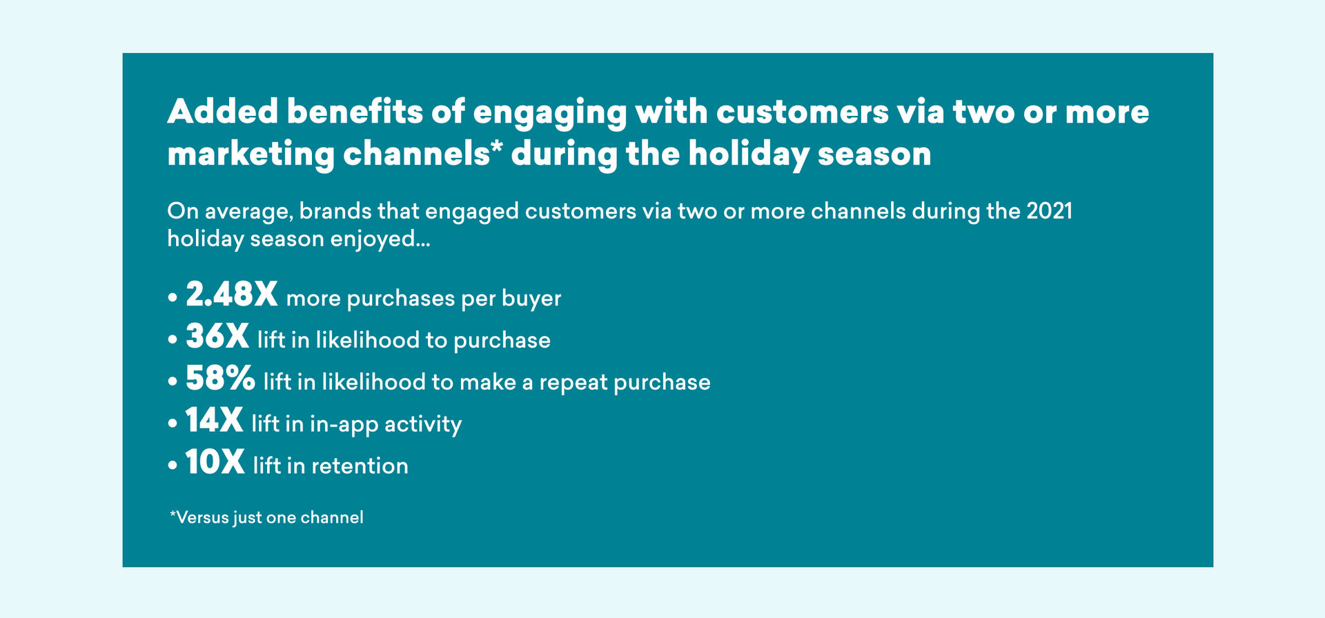 Users tend to be more receptive to messaging during the holidays than during non-holiday times. For each additional marketing channel used, brands generally achieve gains in likelihood to purchase, repeat purchase rates, and average lifetimes during this time of year more so than at other times of the year.
