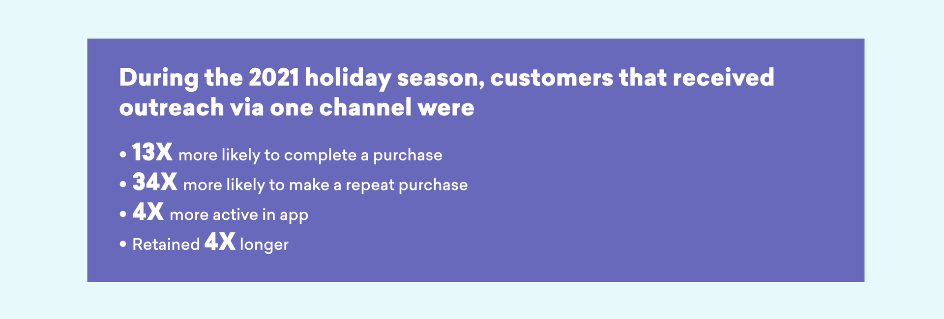 Engaging customers via even a single channel during the holiday season offers plenty of advantages. Customers that opt into receiving brand outreach via just one channel are more likely to make purchases, be active, and stay retained for longer than customers that don't opt into receiving any brand outreach.