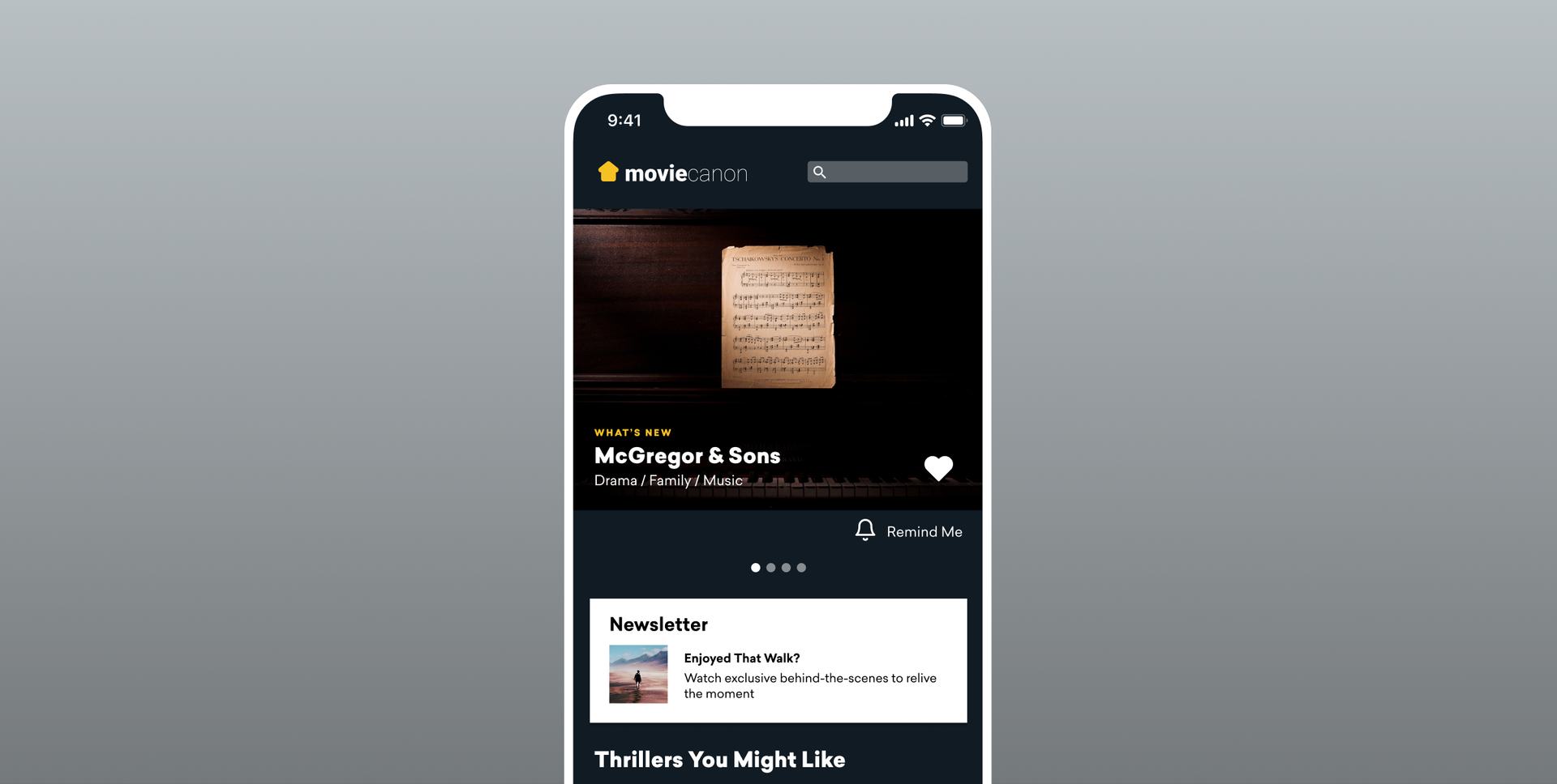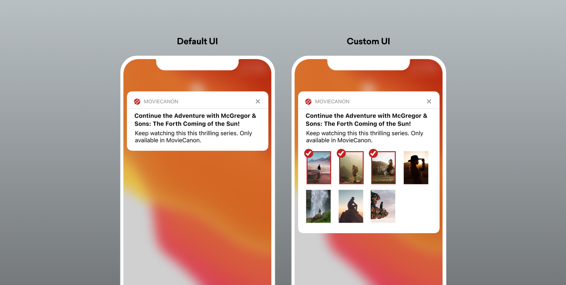 With iOS Notification Content Extensions, brands can make special alterations to the interface of the notifications they send, allowing them to customize the placement of text and other message elements, leverage additional fonts, pull in app-specific data, and more. In this hypothetical example, Movie Canon is using Notification Content Extensions to spotlight personalized content recommendations via a customized version of a standard push notification, providing a memorable, eye-catching experience designed to encourage more users to watch additional content.