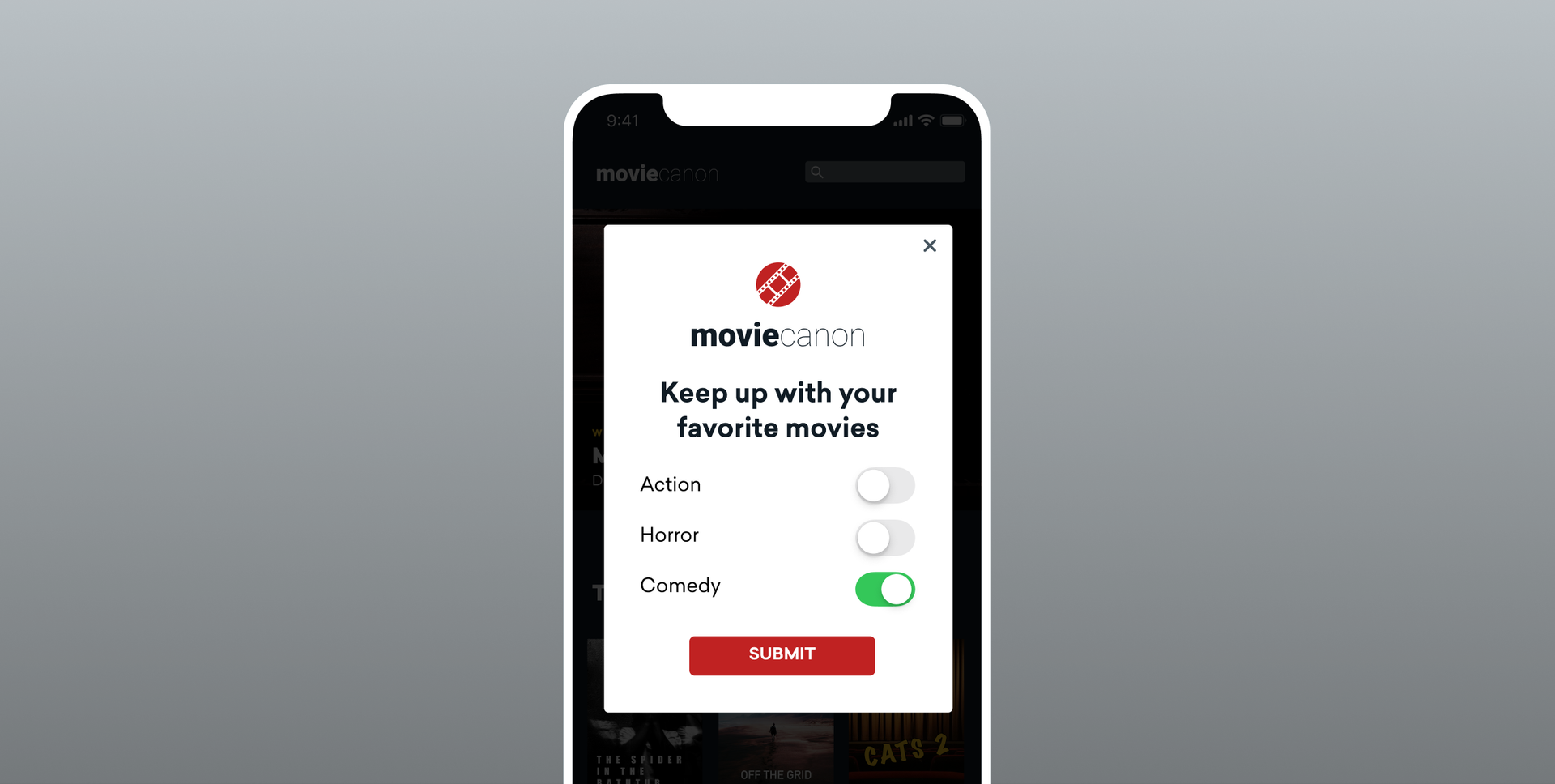 Custom in-app messages can take a lot of forms. In the example above, a (fictional) streaming service, Movie Canon, uses the capabilities made possible by custom in-app messages to allow message recipients to sign up for targeted message alerts based on their favorite movie genres.