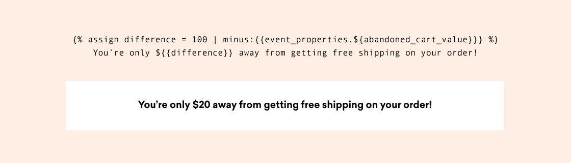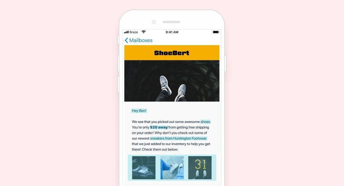 Given that, ShoeBert needs to make sure that it has the information and strategy required to avoid this unfortunate situation. With the right data, it’s possible to reach out to a customer in this situation, calculate the difference between the value of the items in their cart versus the free shipping minimum (using Liquid), then use ShoeBert’s recommendation engine and Braze support for Connected Content to recommend relevant items to them that can help them reach that limit.