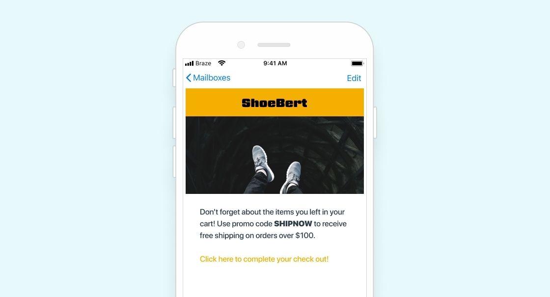 Let’s imagine a fictional footwear company called “ShoeBert.” Today, they run a pretty standard abandoned cart campaign, nudging customers to take advantage of free shipping on orders of $100 or more. Their messaging is well written, but doesn’t include any personalization: