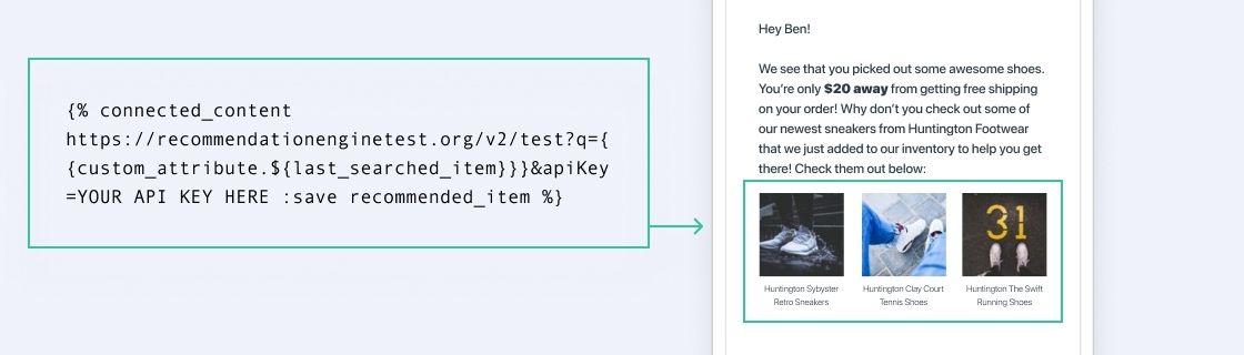 Next, take a look at the campaign’s Connected Content call, which is going to hit ShoeBert’s in-house recommendation engine. They’ve templated in their “favorite brand” Custom Attribute, which is Huntington Shoes. From there, they utilize Connected Content to to make a call via API to ShoeBert’s servers, with a query term of “last searched item,” which is another data point that the Braze team suggested they collect. From here, the API call returns the top three product recommendations for this customer to template into the message body.