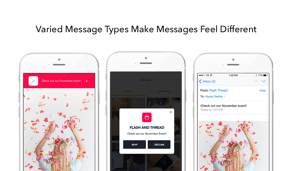 Imagine that Flash & Thread has a monthly lifestyle event you want customers to attend. While the messages you send each month focus on encouraging attendance, using a combination of push notifications, in-app messages, and emails, can keep you from relying too much on any one channel.
