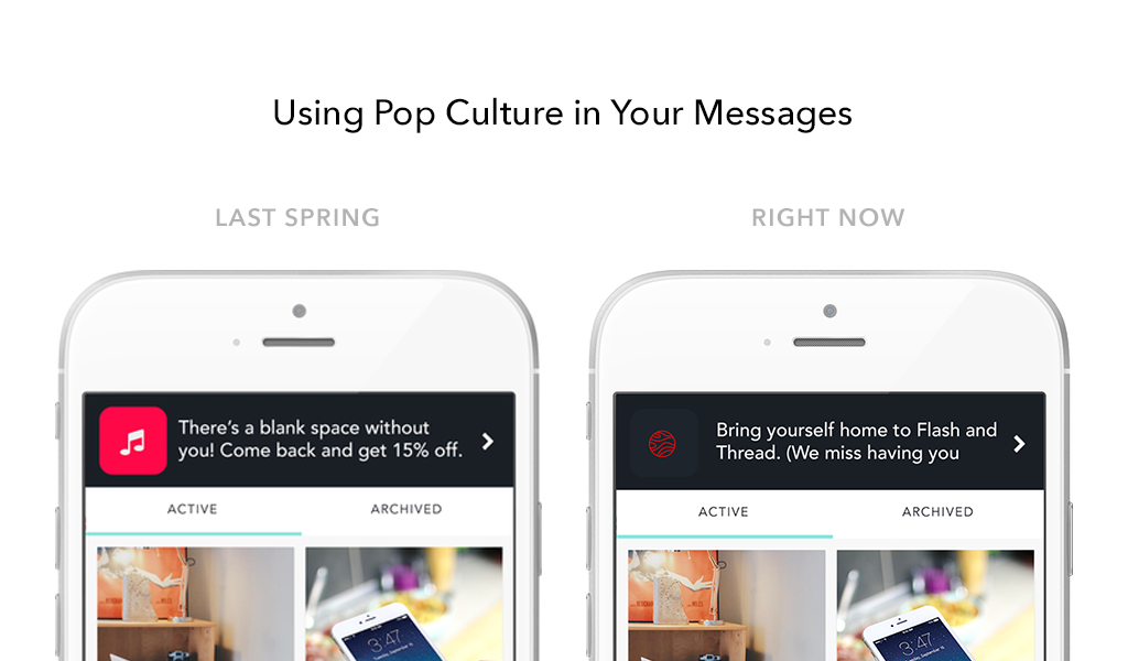 Imagine your brand has a clothing and lifestyle-focused app—let’s call it Flash & Thread—that struggles with low customer engagement. You’ll send campaigns meant to get formerly active customers to give the app another try. Because pop culture comes and goes quickly, referencing it makes that message feel current, even if its purpose is similar to ones that you’ve sent before.