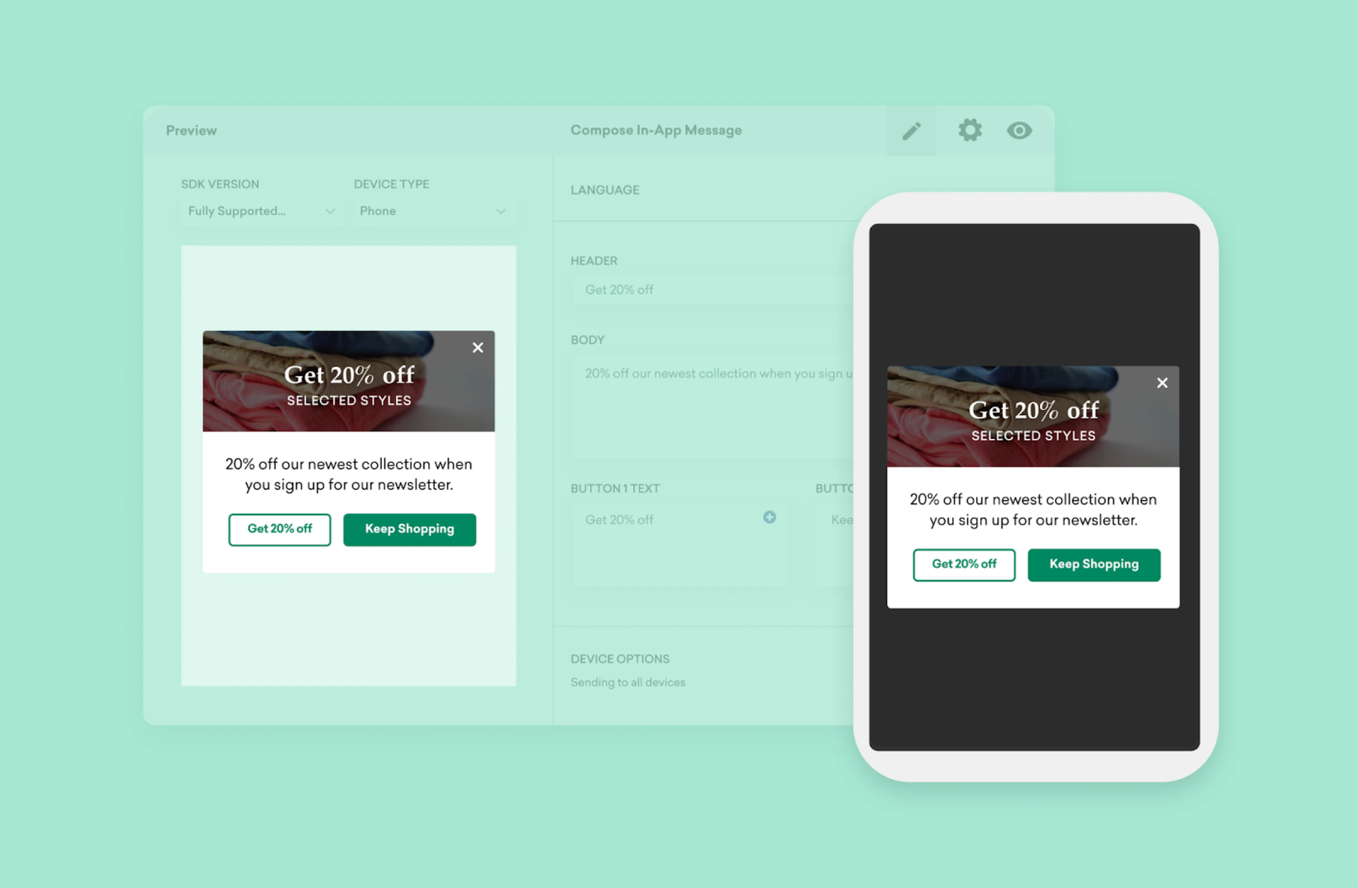 Part of choosing your use case is deciding which platform to use. In Braze, you can choose to create in-app message campaigns for mobile apps, web browsers, or both at the same time. If you want to confirm a mobile user’s in-app purchase, send an IAM. Maybe you want to encourage web visitors to subscribe to your email newsletter. In those cases, in-browser messages are a great option. Want to share a promotion to both web and app users? It’s easy to create and send both of those messages in a single interface in Braze.