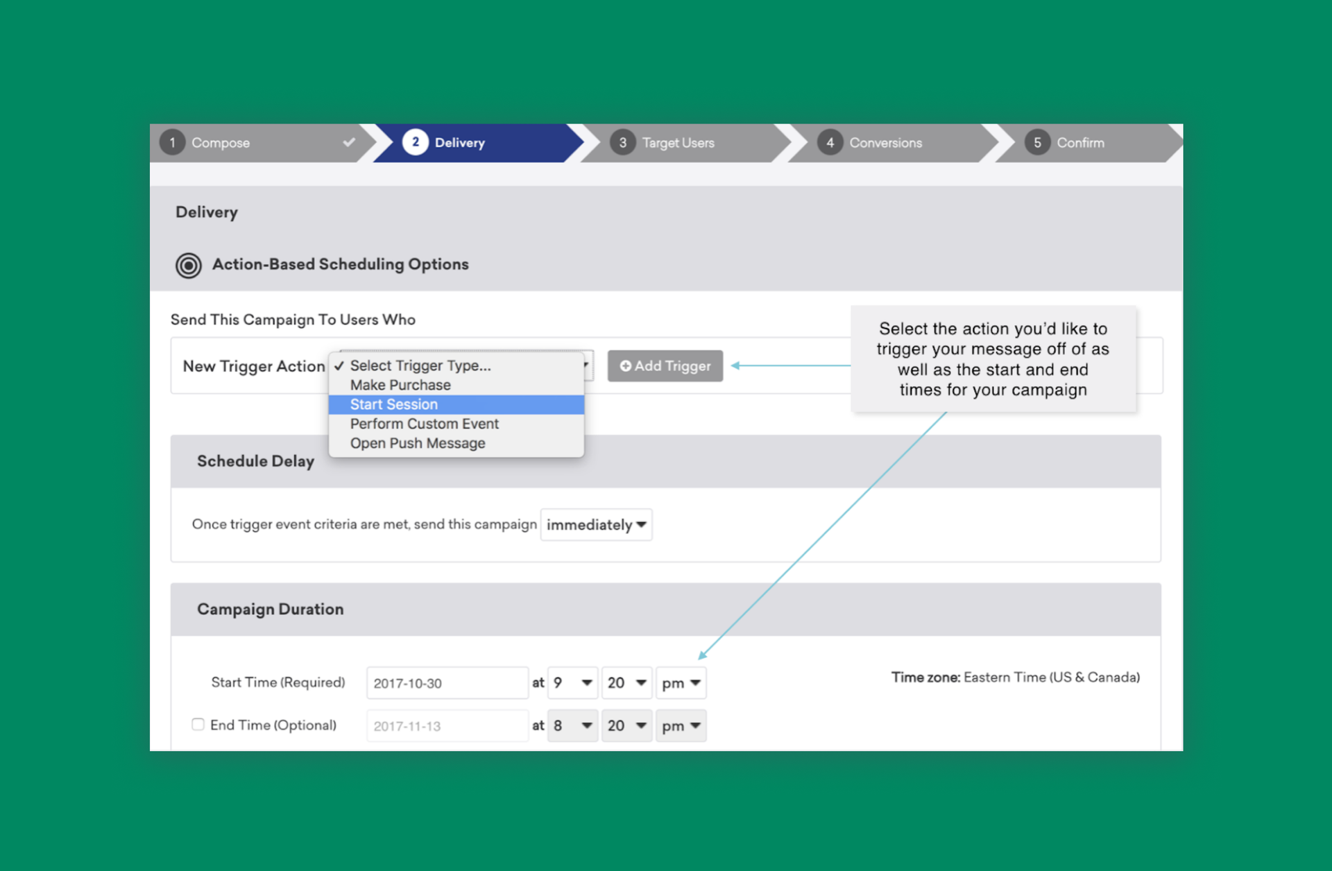 Your in-app message is looking good, and you’re nearly ready to send it. But before you can hit send, you’ll need to determine when to send your IAM and who should receive it.