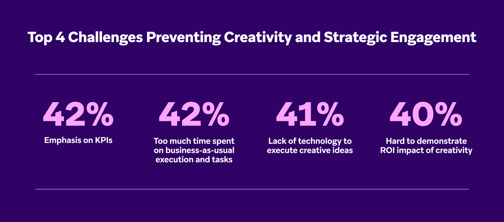 If you feel like your campaigns and efforts could be both more creative and more strategic, it’s not just you. Nearly every marketer we surveyed (98%) told us they’re facing issues that are getting in the way of innovating in these areas. So what’s the problem, exactly? According to our findings, there’s actually not one dominant roadblock, but a handful of challenges. Roughly four in 10 marketers say they’re struggling with: