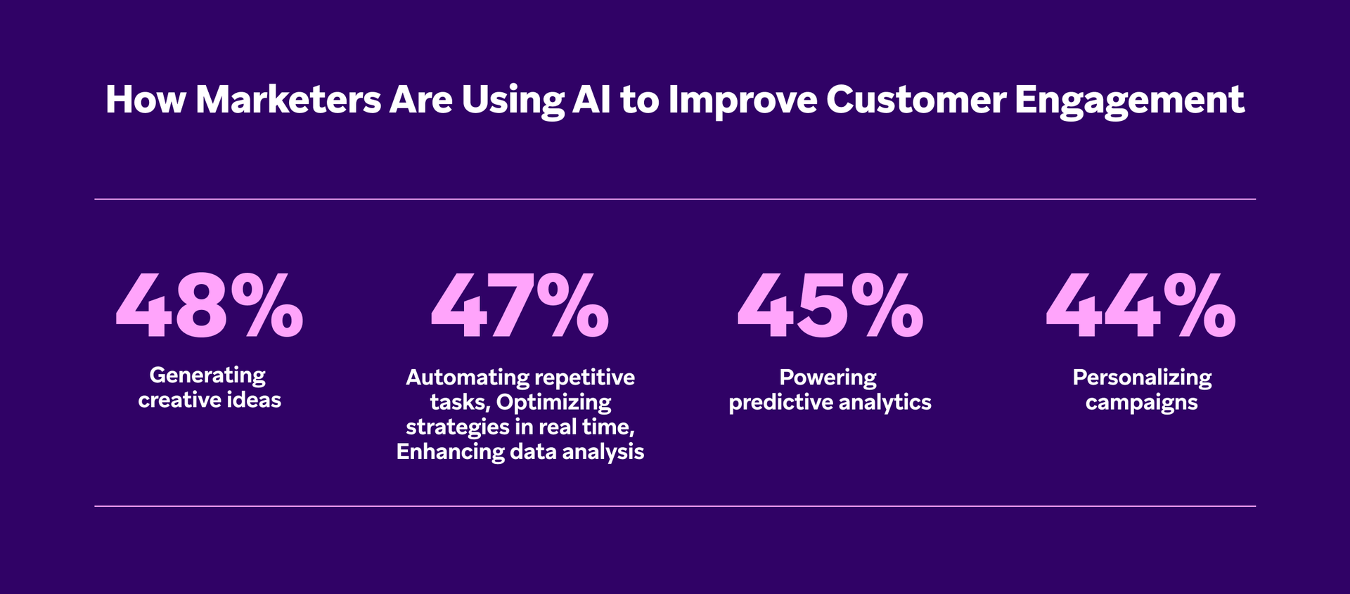 The good news? Artificial intelligence (AI) can help. In fact, 79% of our research participants say AI can “help automate routine tasks and free up more time for creative thinking.” While most professionals say their organizations are already using AI (99%), there’s room for growth when it comes to making use of it to bolster strategic, creative customer engagement. Just about half of respondents say they’re using (or planning to use) AI to enhance customer engagement—including to: