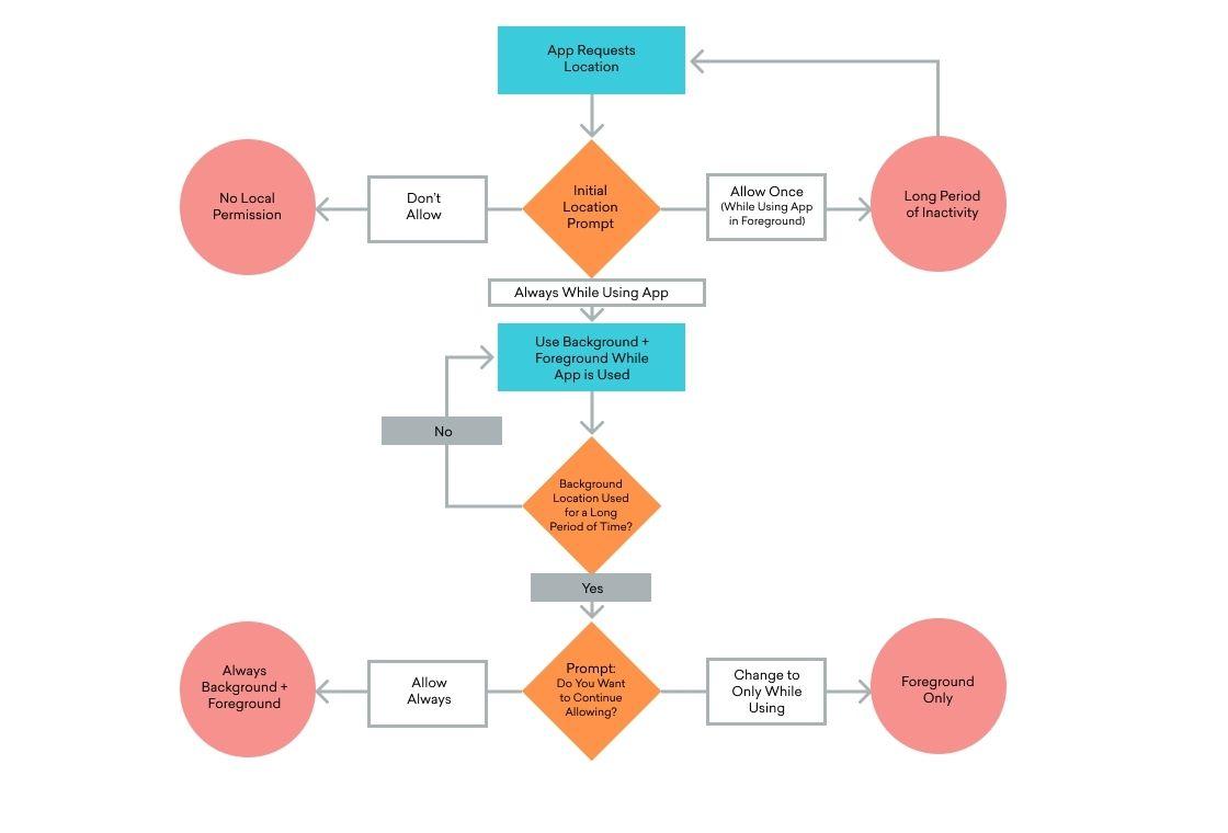 These changes add a new level of complexity to asking for and receiving location data permissions from you users on iOS. Not only is it challenging to know how to shepherd them through—from initial prompt to always-on data collection— but it can be hard to visualize what that journey looks like. To help out, we’ve put together a handy flowchart that dramatizes the ways that a request for a given users’ location can play out: