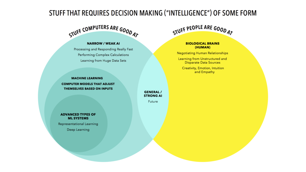 Today’s AI is great at processing vast quantities of data to find hidden patterns and actionable insights, and making high-speed decisions in connection with a specific goal. People, on the other hand, are way better than computers at creative thinking. And that’s a great thing.