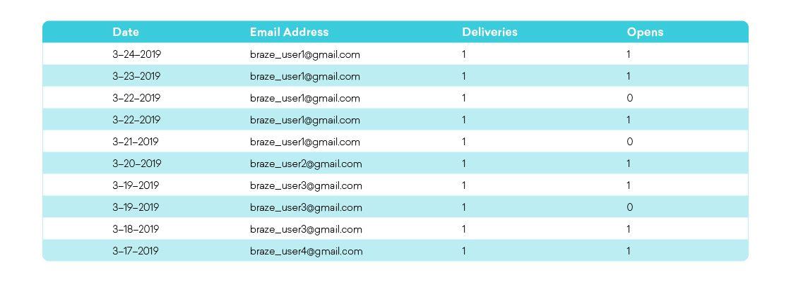 Say you’re working with event-based data, like the data coming from our Braze Currents data export tool. To calculate frequency, you’ll first want to partition your data by a few dimensions: the date granularity of your choosing (day, week, or month, depending on your use case), each individual’s user identifier or email address, and a rollup of high-level metrics like deliveries and opens. That will produce a table like this one:
