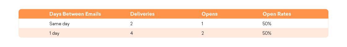 Here, we see that both same-day emails and emails with 1 day between them had a 50% open rate. Again, every data source is different, and every business model has its own requirements, so you should perform this analysis yourself to find out what works best for your brand’s particular use cases. But when your team analyzes cadence, this is the kind of data you’ll want to be looking at.
