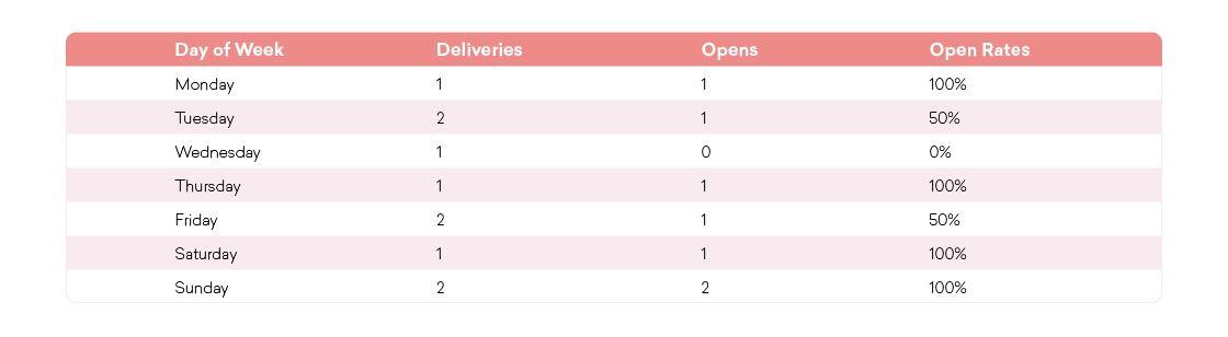 Let’s move on to cadence. If you have data that details the days and times on which your users are most likely to engage with your messaging, cadence will be easy to calculate. For example, simply by converting the dates in the data above to days of the week and rolling up the corresponding statistics, we get the following table: