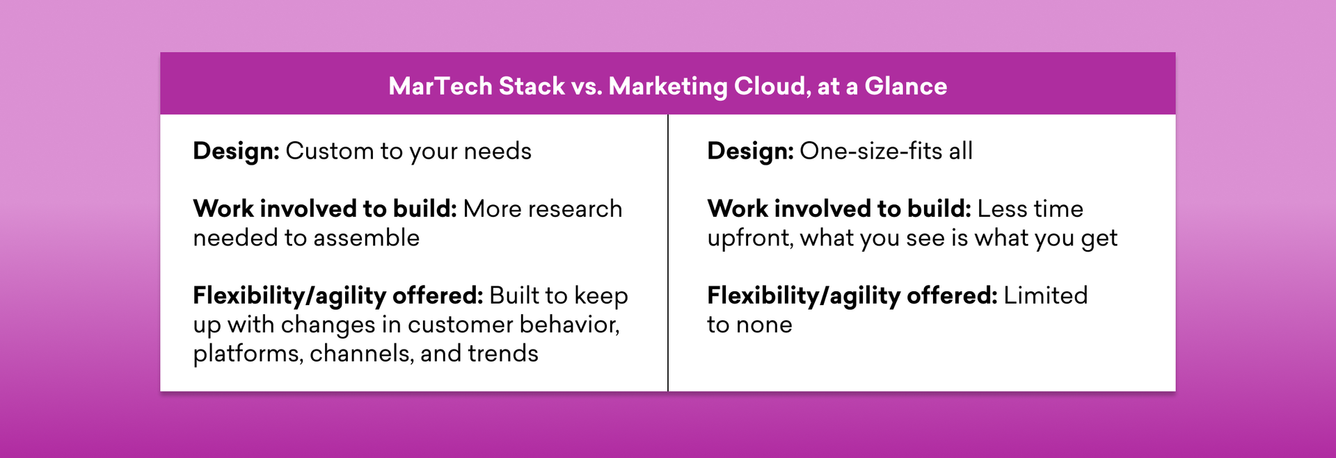 Marketing stacks and marketing clouds offer two different paths for building out the tools your company needs to connect with and grow your audience and drive customer outcomes.