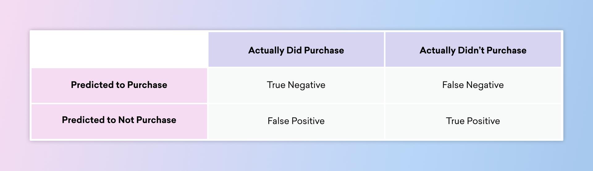 The possible Predictions and possible actual outcomes can be used together to make a so-called “confusion matrix,” where the rows indicate what Braze predicted and the columns reflect what the user actually did: