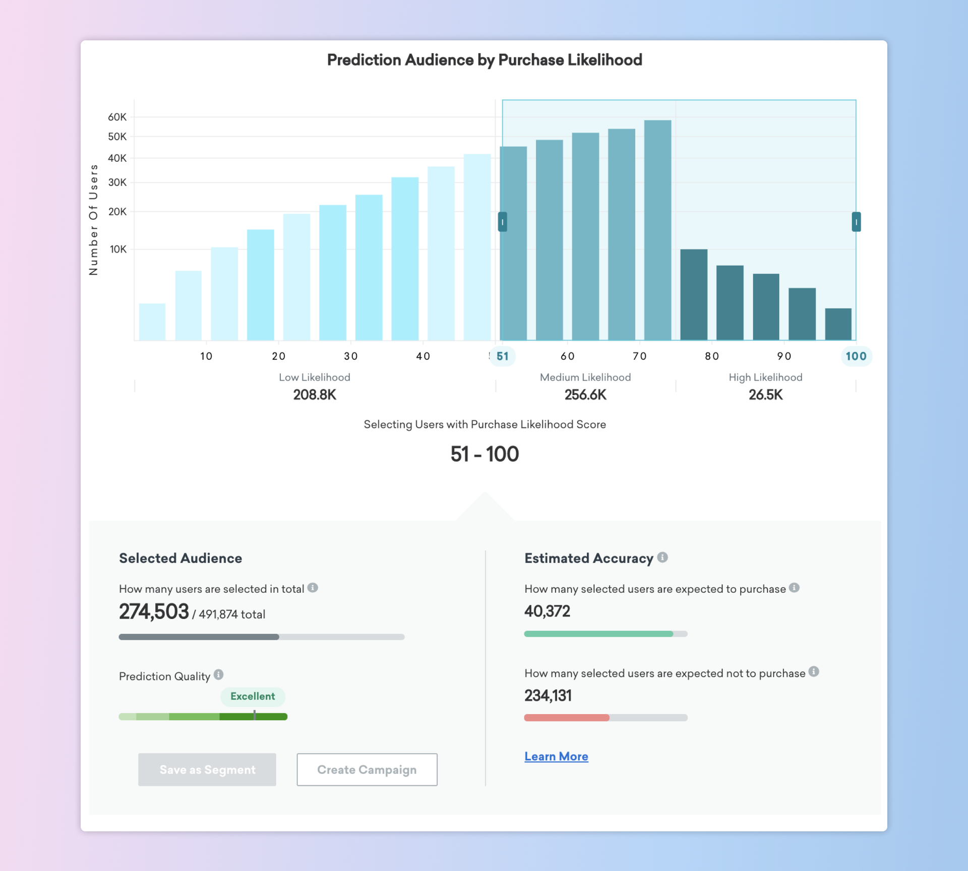 The red progress bar gives us an additional piece of key information—namely, that this setting will also target 15,385 users who won’t make a purchase, despite the fact that we’re targeting the individuals in this population with the highest purchase likelihood. These users are false positives: That is, individuals who the Prediction tells us will make a purchase, but who actually won’t. In this case, only about 15,000 of the 447,000 users who won’t make a purchase would be messaged, which is about 3.3%. While that’s low as a percentage, your specific audience and business model will inform whether that’s an acceptable level of error for your business.