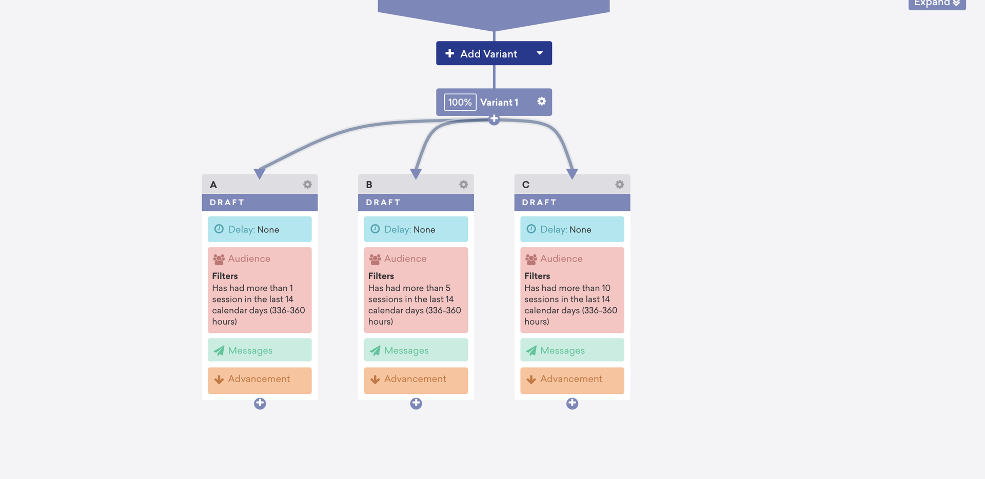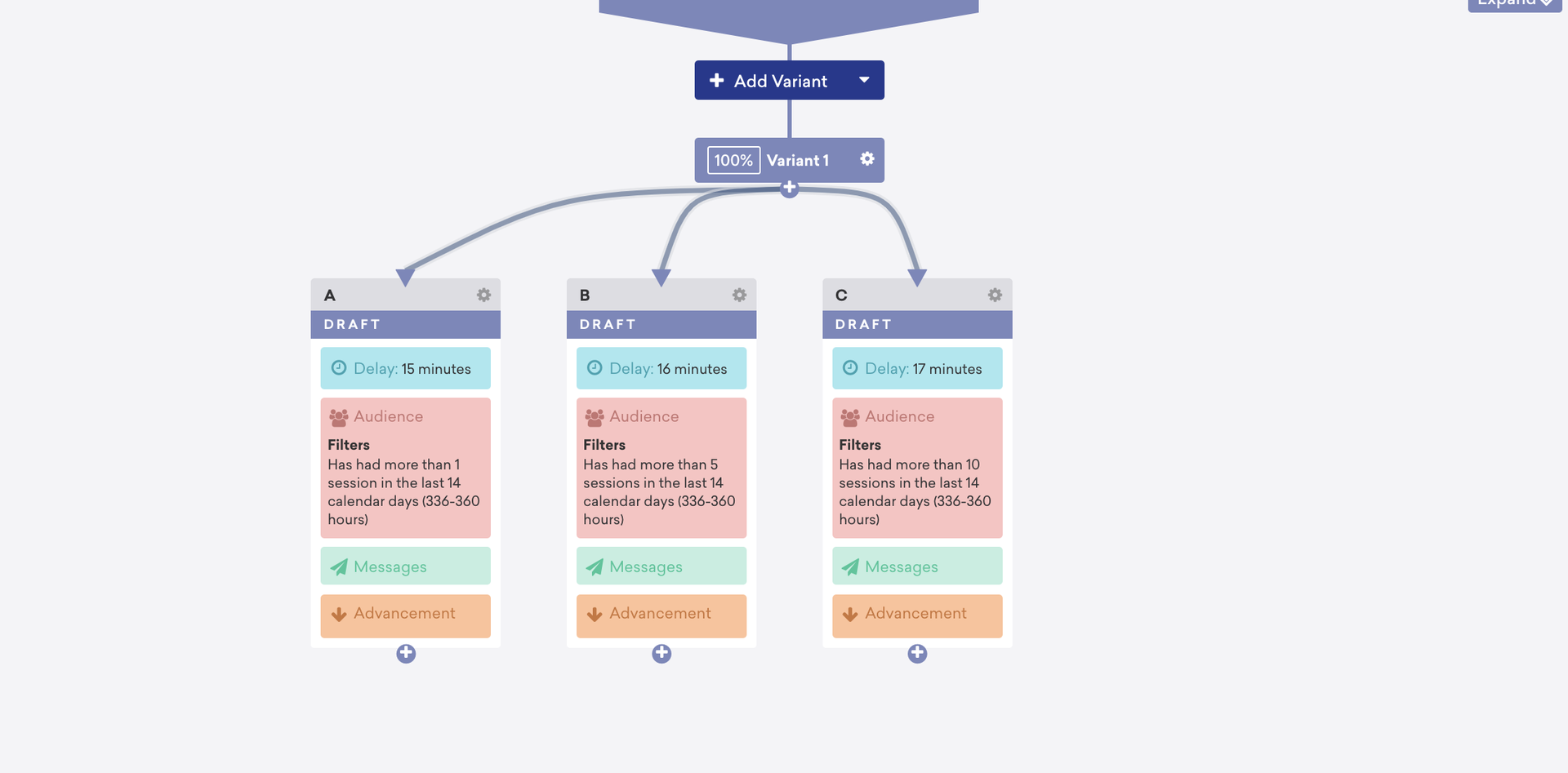 In the example above, a user who would otherwise qualify for all three steps will actually receive Step B every single time. It won’t be the right choice for every situation where you’re looking to manage prioritization, but it can be an effective way to give yourself more control over the way that messaging is served up to your users.