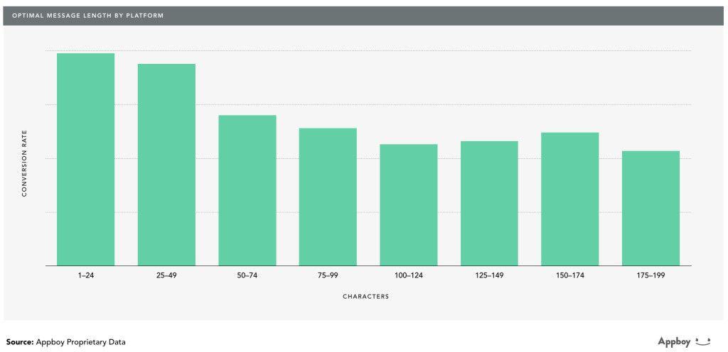 While push notifications are often brief, some marketers send messages in this channel that are up to 200 characters long. Appboy’s research found that these longer messages performed notably worse than short ones on both iOS and Android.