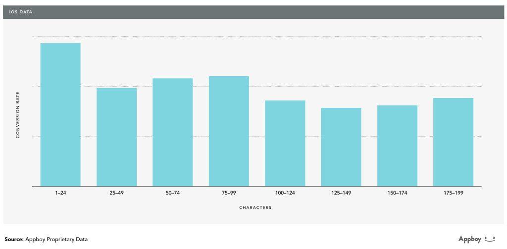 For iOS, push notifications with character lengths of fewer than 25 characters had the highest number of conversions (which can include purchases, app opens and other events designated by the app), with messages over 100 characters seeing particularly weak results.