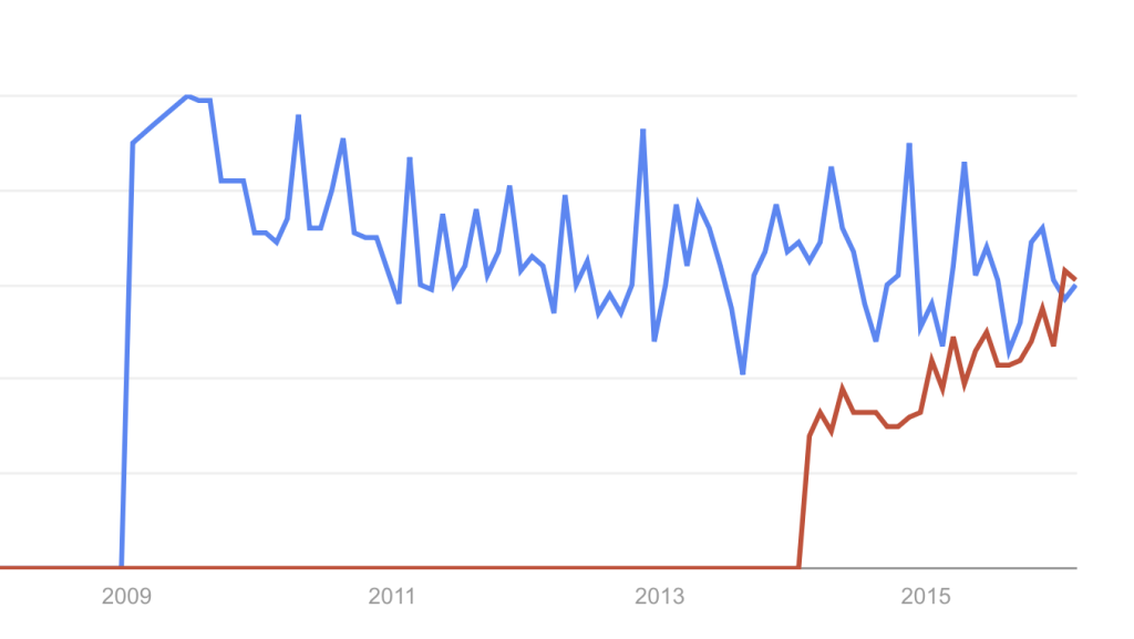Google Trends results for multichannel marketing (blue) and omnichannel marketing (red)