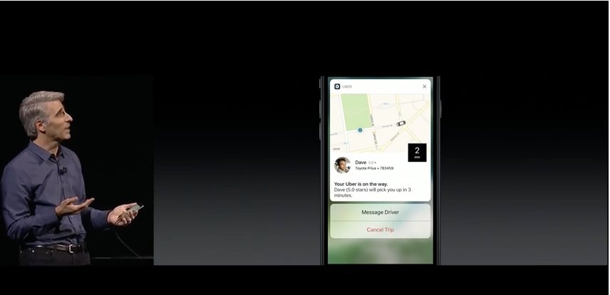 Apple’s Craig Federighi demonstrating iOS 10’s support for live ride-hailing tracking within a push notification