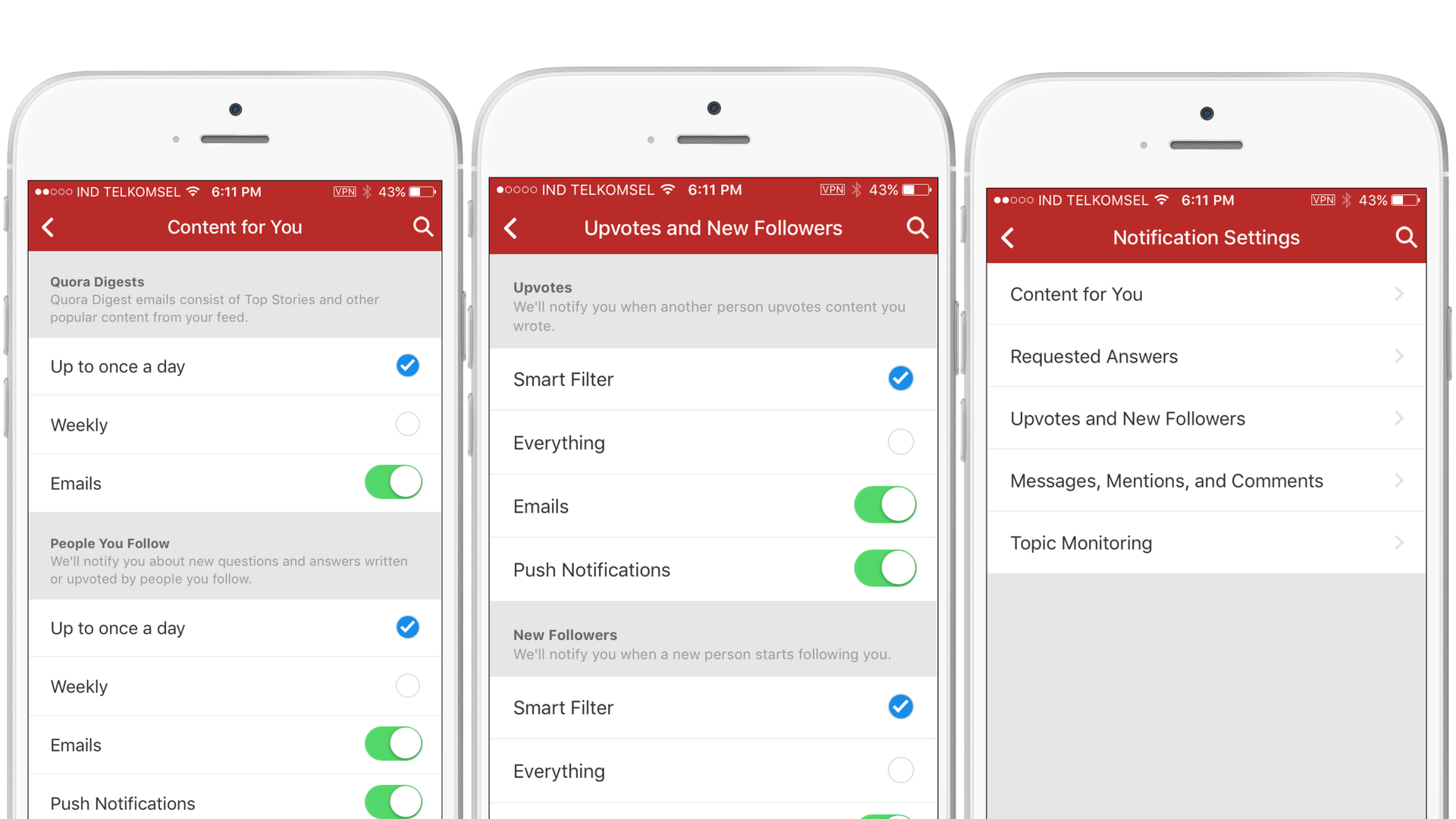 This question and answer site has a preference center that provides a plethora of options for its users. If you’re quite active on the site, it’s easy to become inundated with activity messagingpush notifications and emails for every upvote, new follower, message or mention or comment you receive, every topic you follow, and more!