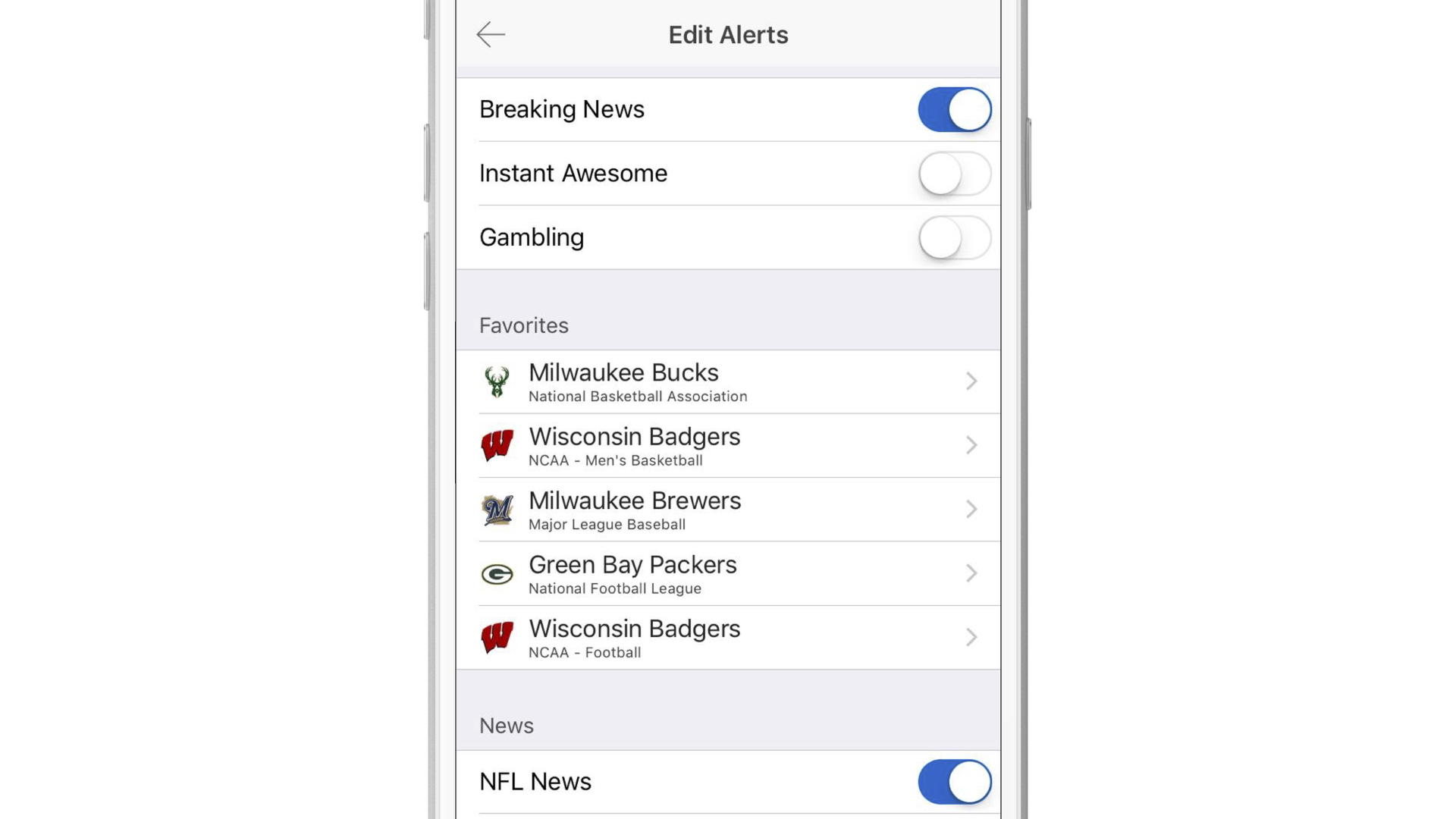The first is the “favorites” section. Users can choose their favorite sports teams to follow. Within each team, users are given the option to receive alerts on team news and in-game updates (you can get as detailed as per-quarter updates).