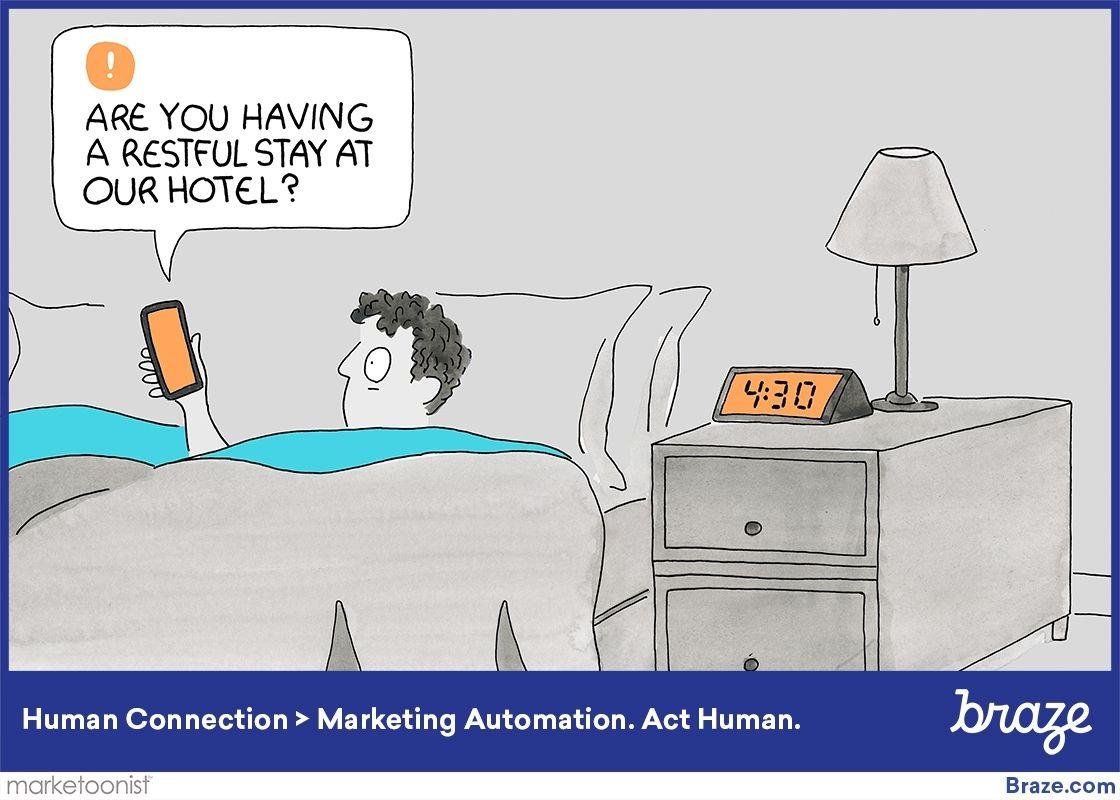 Happily, the machines powering digital experiences are not subject to the same stressors as gate agents, flight attendants, store personnel, customer service representatives, and other human staff. But technology systems programmed with a set-and-forget mindset can lead people like our sleepless friend pictured above to yearn for the crabby desk clerk who at least would have known better than to knock on the door in the middle of the night.