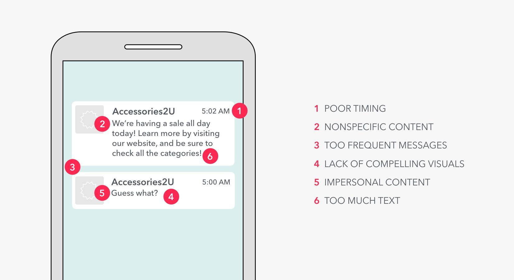 In this hypothetical example, you’ll see that the example ecommerce merchant sent not one but two push notifications back to back (within the span of 30 minutes). While this approach may seem to be a catchy way to engage users, it can actually be off-putting and come off as spammy. In some cases, it will make sense to send multiple push notifications (like possibly the first and last days of a sale), but even then, you’ll want to make sure that each message is helpful and informative. The first notification shown here doesn’t provide any value, which ties back to the point above—message content.