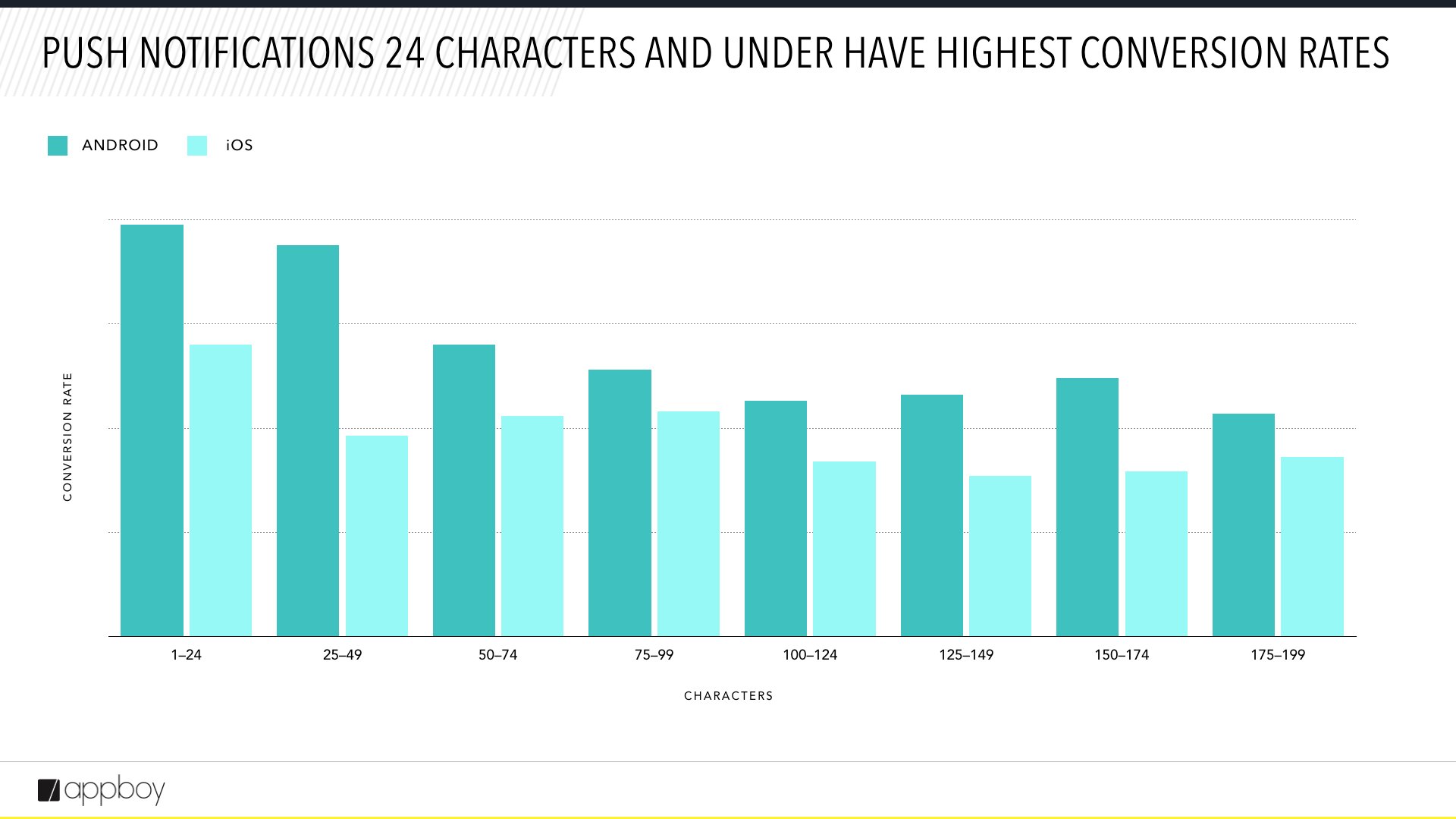 Even though the text of this imaginary push notification isn’t saying much, there is still probably too much of it. Appboy’s research shows that the ideal length for push notifications to get the best conversion rates is 24 characters, with the second best being 50-74 characters for iOS and 25-49 characters for Android.