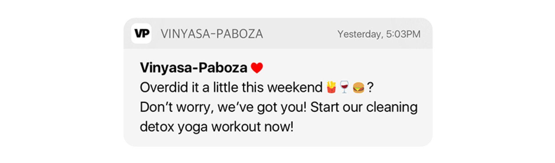 The juxtaposition of “overdid it a little this weekend” with the fries, wine and burger emojis communicates that this person didn’t overdo it in the typical sense—that is, instead of working too hard, they played too hard—but the fun (or perhaps nagginess) of this notification is in its indirectness. Being attuned to the subtleties of language to the extent that you can imply what you mean without actually stating it is an excellent tool to have in your language toolbelt.