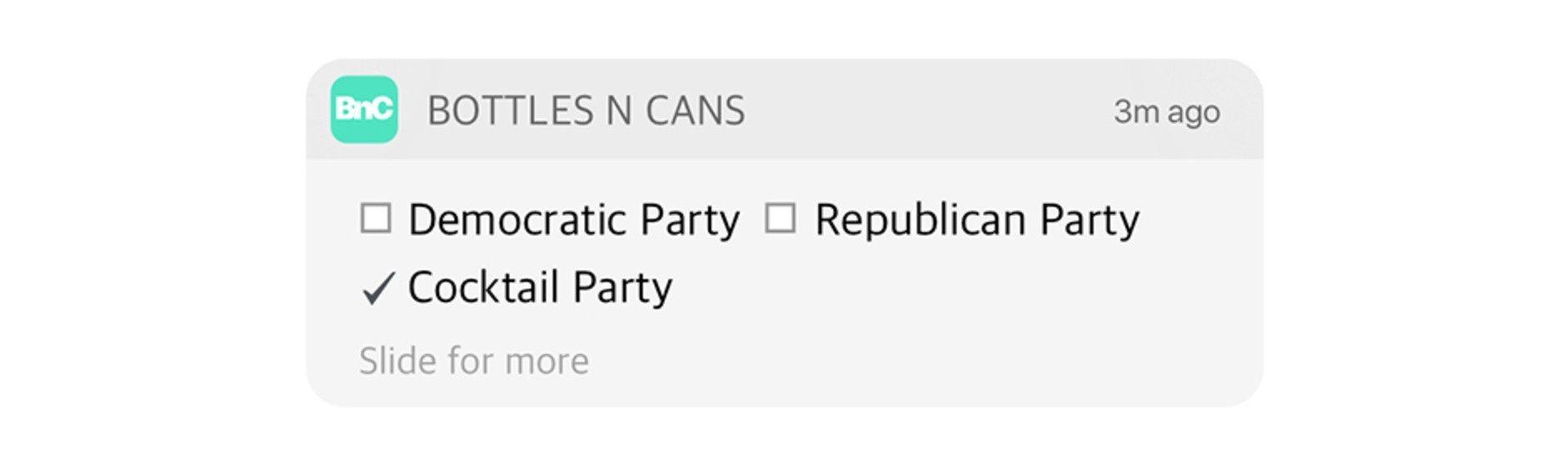 On its surface, this notification approximates the form of a voting ticket. Obviously. We get our first options, which are the choices we Americans would expect, and then those expectations are humorously subverted. The legerdemain is a play on the word party. And having the two uses of the word beside each other points to the sober humorlessness of politics, as opposed to the reckless freedom in a cocktail party. And freedom is what we want, right?
