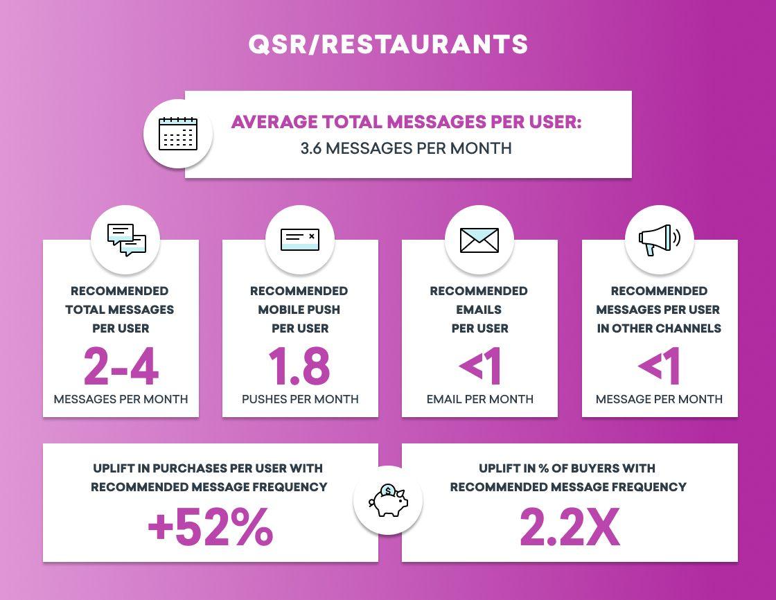 We found that QSR and restaurant brands that send between two and four messages per month really hit the sweet spot, with users in this segment 52% more likely to be buyers and making purchases 2.2X more often. While there’s room to adjust that cadence up or down a bit based on your brand’s individual situation and needs, this is a situation where staying where you are might be the best course of action.